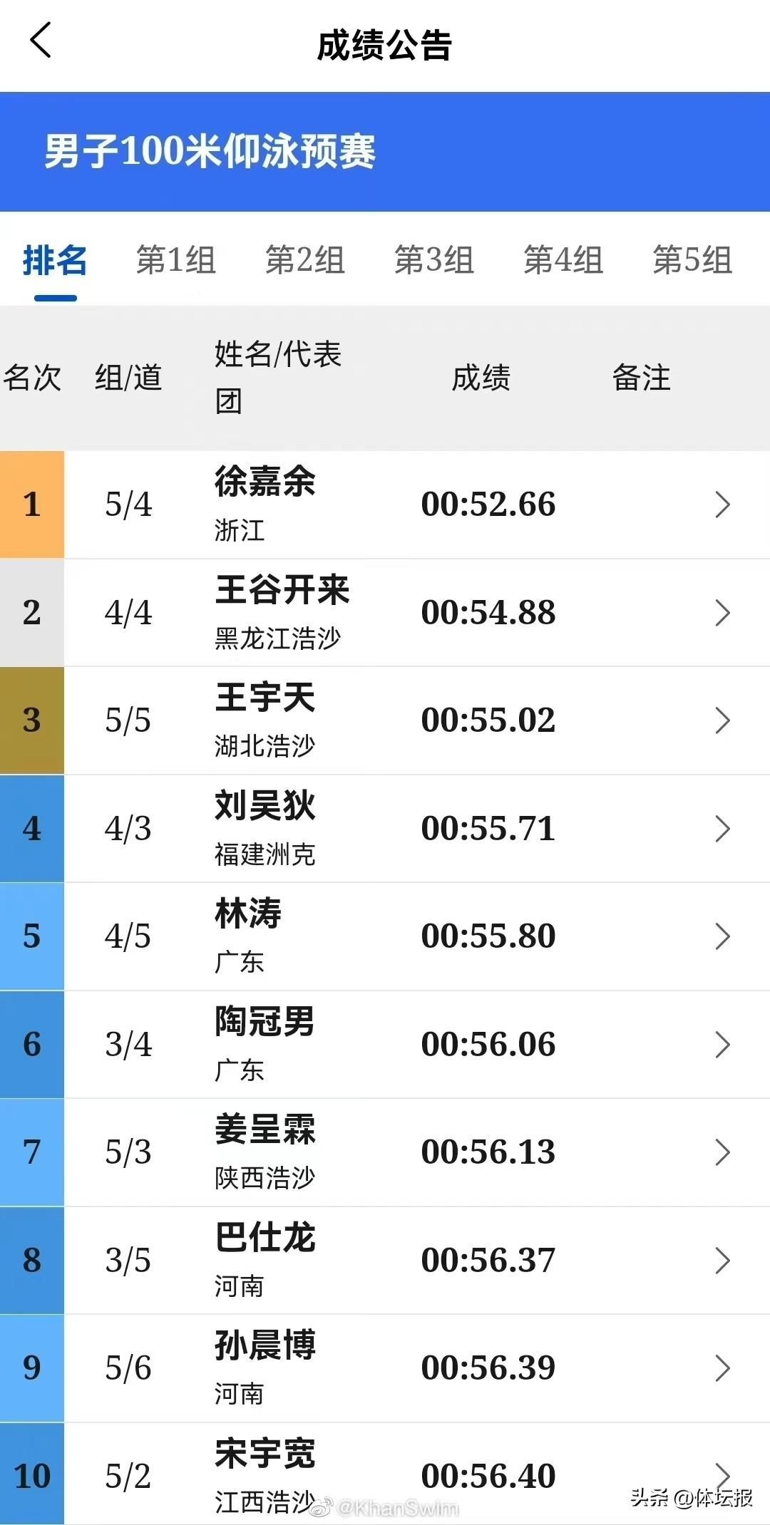 2023全國游泳冠軍賽進入首個比賽日的爭奪,男子100仰預賽中,世界冠軍徐嘉餘迎來今年首秀,以52秒66的成績,甩開第二名2秒多,順利進入晚上的決賽。賽後徐嘉餘也笑了,他目前的仰泳水平,在國內還無人動搖。