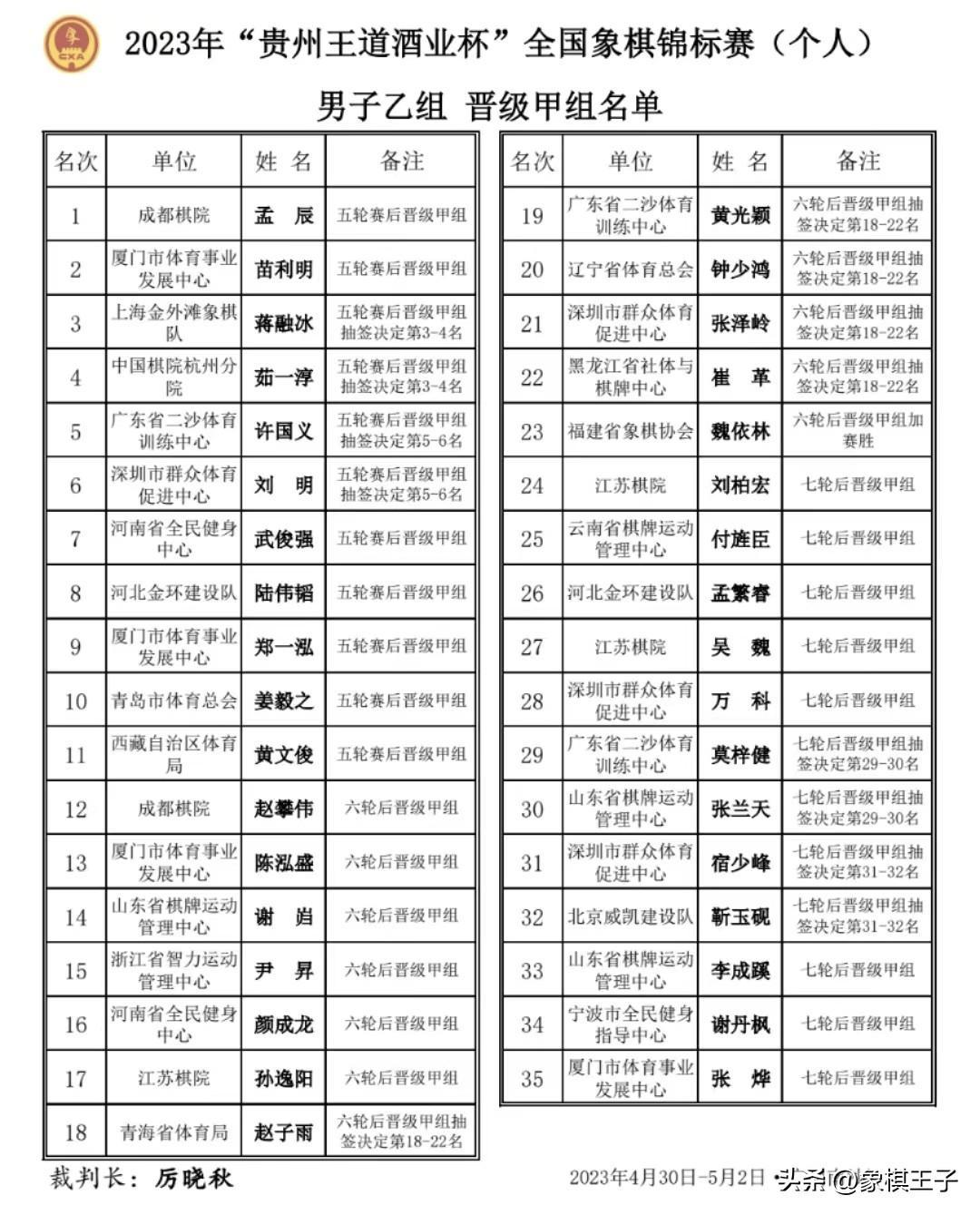 5月2日,2023年全國象棋個人賽男子乙組最後一輪比賽在廣州南沙戰罷,升甲名單全部產生,孟繁睿、萬科等成爲最後一批踩點晉級棋手,共三十五人入圍男甲。男甲大戰2日下午三點開啓,象棋王子全程直播。