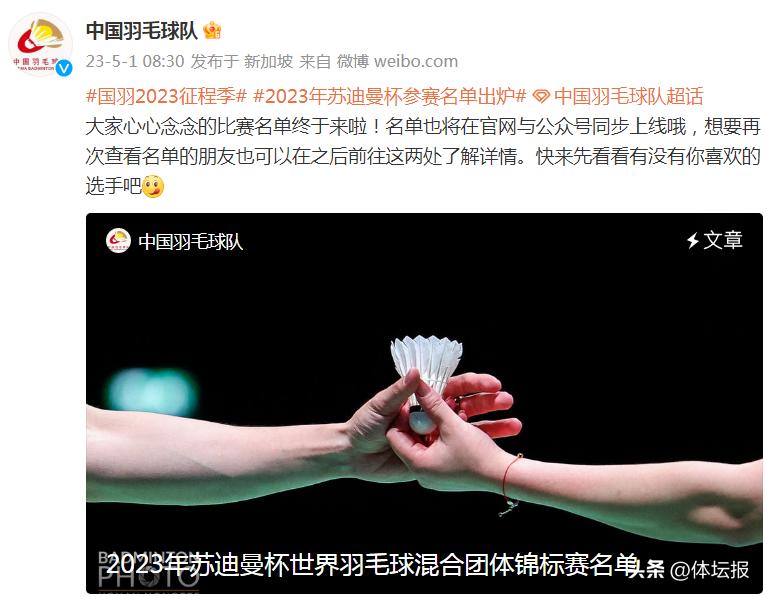 中國羽毛球協會5月1日公佈了2023年蘇迪曼杯世界羽毛球混合團體錦標賽中國隊參賽名單,奧運冠軍陳雨菲、世界冠軍鄭思維/黃雅瓊(“雅思組合”)領銜參賽。