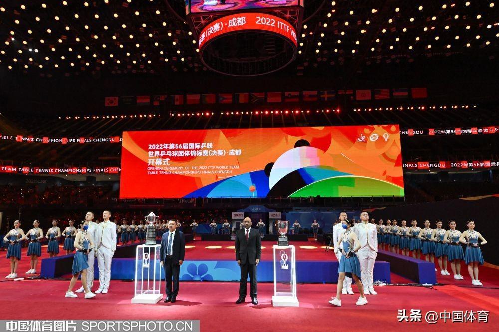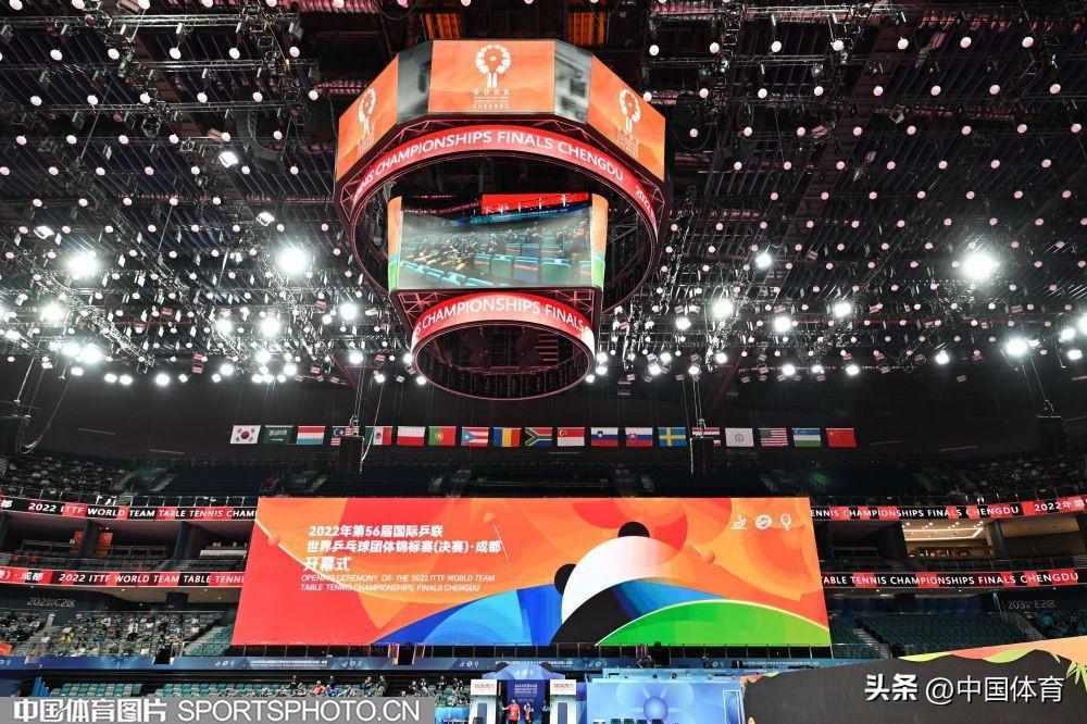 中國體育訊 “乒世界,品成都”。9月29日,2022年第56屆國際乒聯世界乒乓球團體錦標賽(決賽)開幕儀式,在四川省成都市高新體育中心舉行。在接下來的10天時間裏,來自全球的乒乓球運動員將向着世界乒乓球團體最高榮譽發起衝擊。(中國體育圖片 白宇 攝)