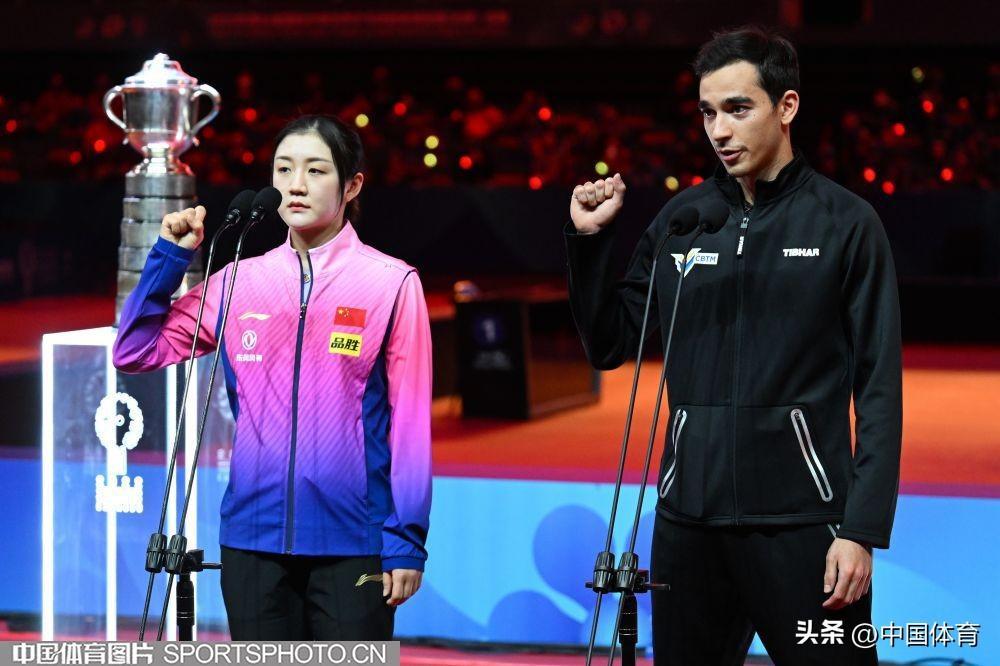 圖爲中國選手陳夢、巴西選手雨果·卡爾德拉諾代表運動員宣誓