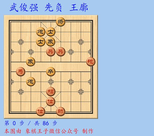 衛冕冠軍、關東少主王廓可謂超神運,王廓在與實力派戰將武俊強打入雙炮卒士象全對馬炮雙兵仕相全的殘棋後。