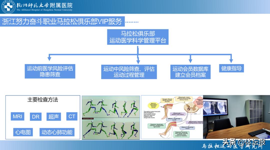 爲保障俱樂部選手的運動安全,減少運動損傷,延長運動生命,提高運動成績,俱樂部聯合杭州市馬拉松運動醫學研究所,整合研究所的各類醫療設備資源,對進入俱樂部的每一位選手運動相關的身體狀況進行檢測,並建立專屬檔案;對每一位選手的運動信息、身體狀況指標進行動態跟蹤觀測,並提出運動醫學指導;進行基礎健康信息檢測,對選手展開多項評估,如:運動心肺功能評估;身體靜態姿態評估;關節結構詳細檢查與評估;運動姿態評估;運動素質評估;運動過程評估;運動營養評估與檢測;部分選手的相關基因檢測與評估,通過運動健康檔案,定期進行多學科聯合會診,根據俱樂部選手身體狀況提供個性化的運動處方和醫學康復建議,實現全方位科學管理,爲俱樂部成員科學訓練、提升成績,保駕護航。