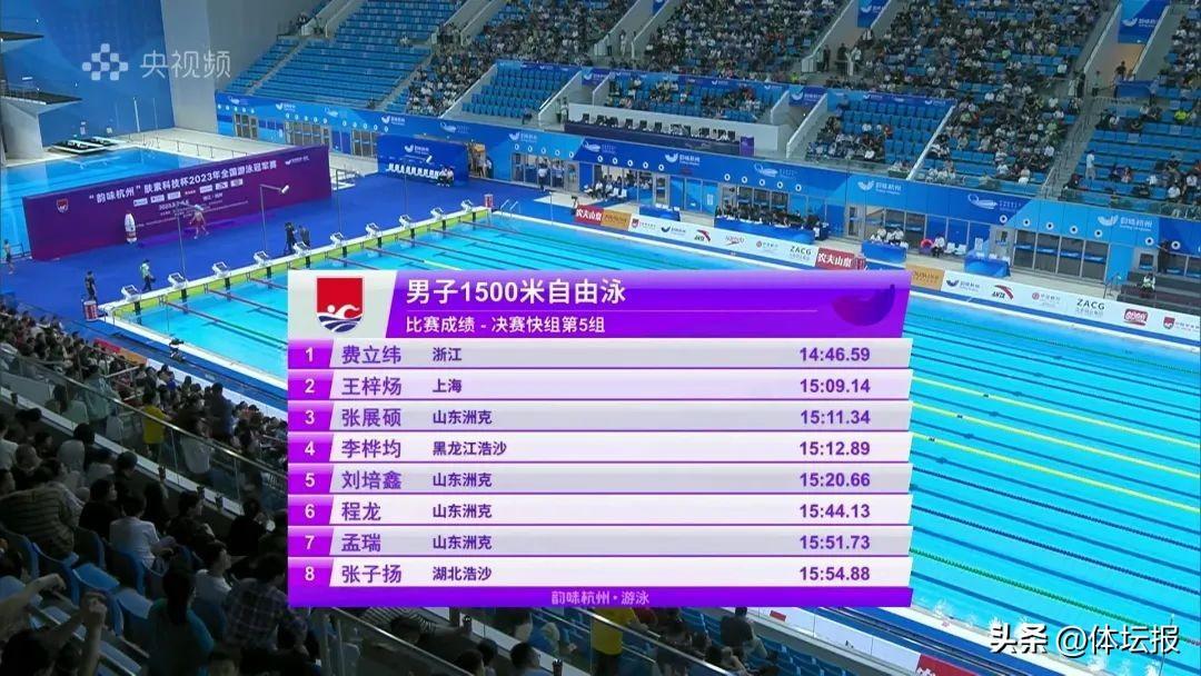 在今天晚上進行的男子1500米自由泳決賽中,杭州小夥費立緯再次創造個人最佳成績,以14:46.59獲得金牌,這個成績比他在3月春錦賽的奪金成績快了13秒多。也遠遠超出15分04秒64的福岡世錦賽A標,15分00秒99的巴黎奧運會A標。