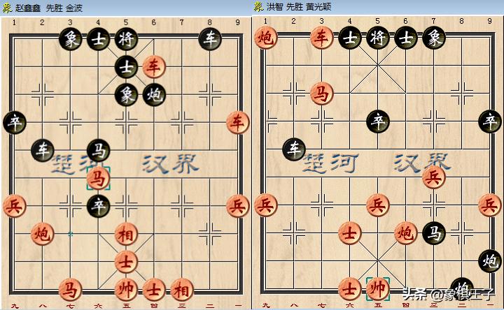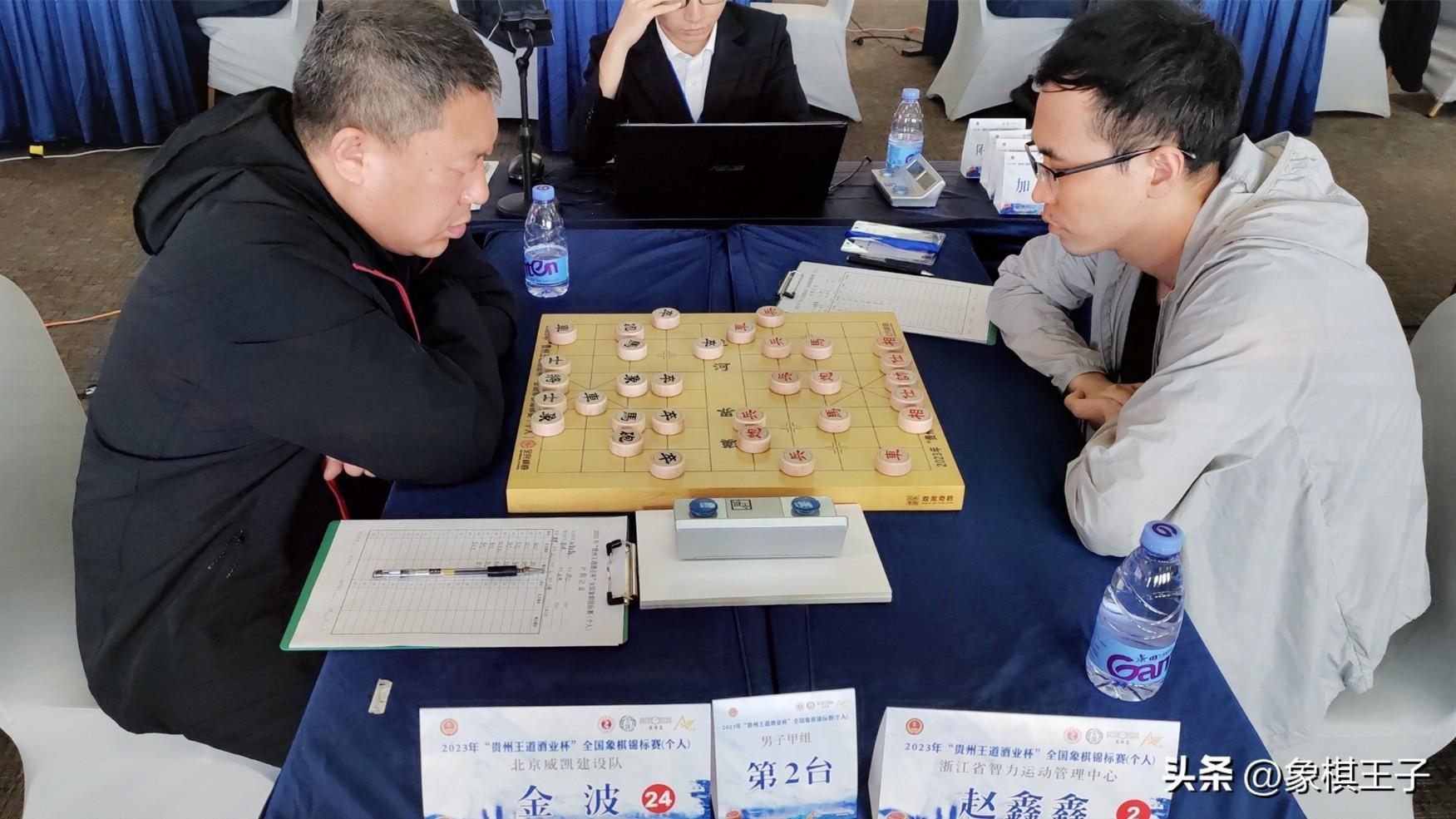 男甲廝殺,六脈神劍趙鑫鑫淘汰老將金波,執先中炮巡河炮局,飛以擒子,多子速勝。