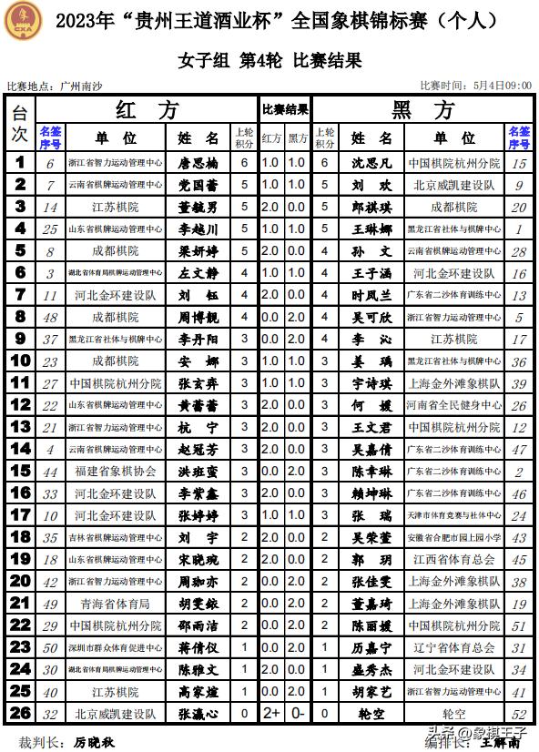 5月4日,2023年全國象棋個人賽女子組第四輪比賽在廣州南沙戰罷,梁妍婷擊敗孫文,董毓男取勝郎祺琪,唐思楠戰平沈思凡,梁妍婷、董毓男、唐思楠、沈思凡,四人同爲三勝一平積7分領先,時鳳蘭、王文君落敗。