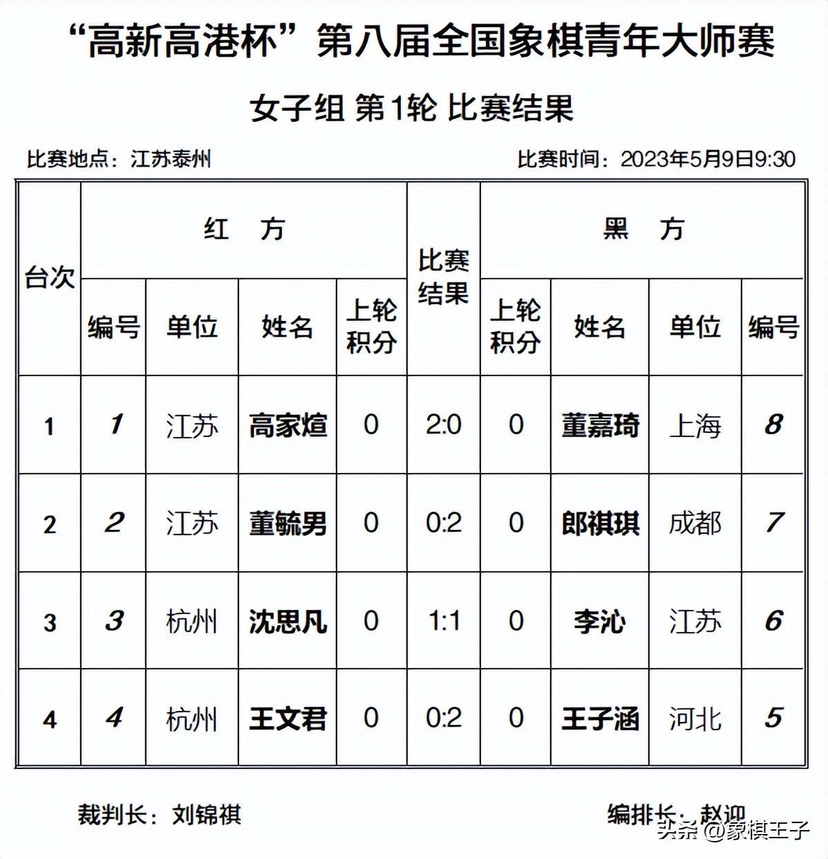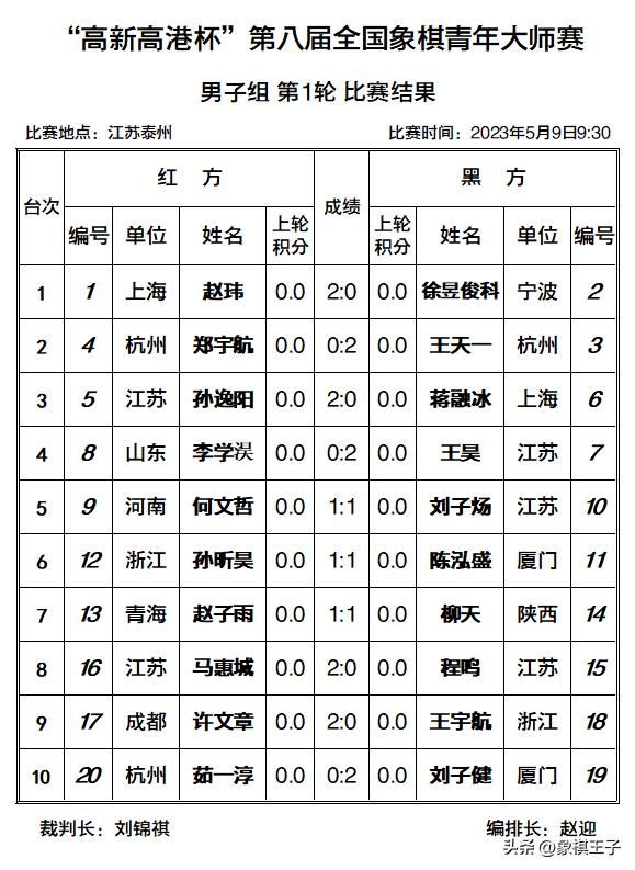 5月9日,2023年高港杯象棋青年大師賽首輪比賽在江蘇泰州戰罷,王天一首場打死車,得兩子擊敗鄭宇航,獲得開門紅,趙瑋取勝徐昱俊科,劉子健、許文章、王昊、馬惠城、孫逸陽,多人勝出,程鳴落敗,女子王文君大漏送車不敵王子涵。象棋王子全程直播