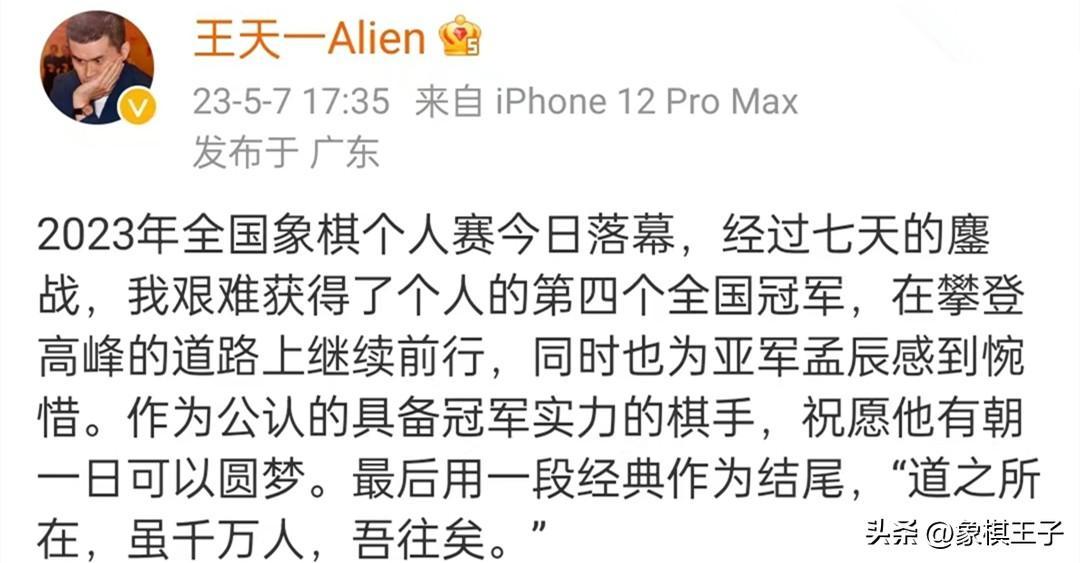 王天一在感言中也提及,獲得第四個全國冠軍,在攀登高峯的路上會繼續前行,爲孟辰感到惋惜,祝願他有朝一日可以圓夢。