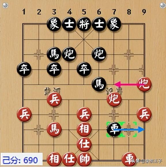 黑方自信十足的提起紅馬就砍,王天一發覺這手,眼睛一亮,迅即平炮打車,黑車逃邊,紅揮炮打底象一將。