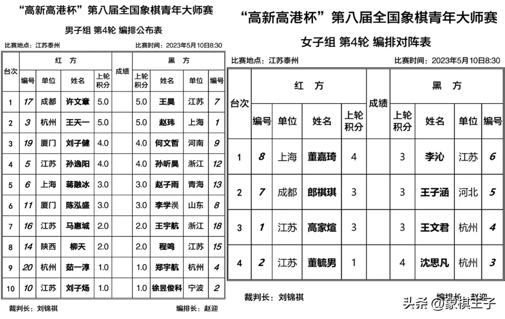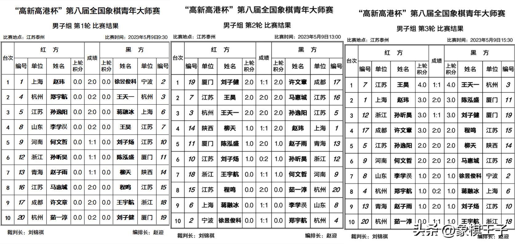 首日中,男子王天一、趙瑋、王昊、許文章四將5分,孫逸陽、何文哲、孫昕昊、劉子健4分。