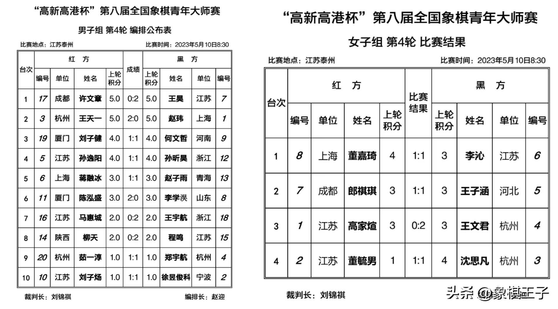 5月10日,2023年第八屆高港杯第四輪比賽在江蘇高港戰罷,王天一擊敗趙瑋,取得四戰三勝一平,提前鎖定四強淘汰賽資格,王昊取勝許文章,同樣打進淘汰戰,女子組王文君獲勝。象棋王子全程直播。