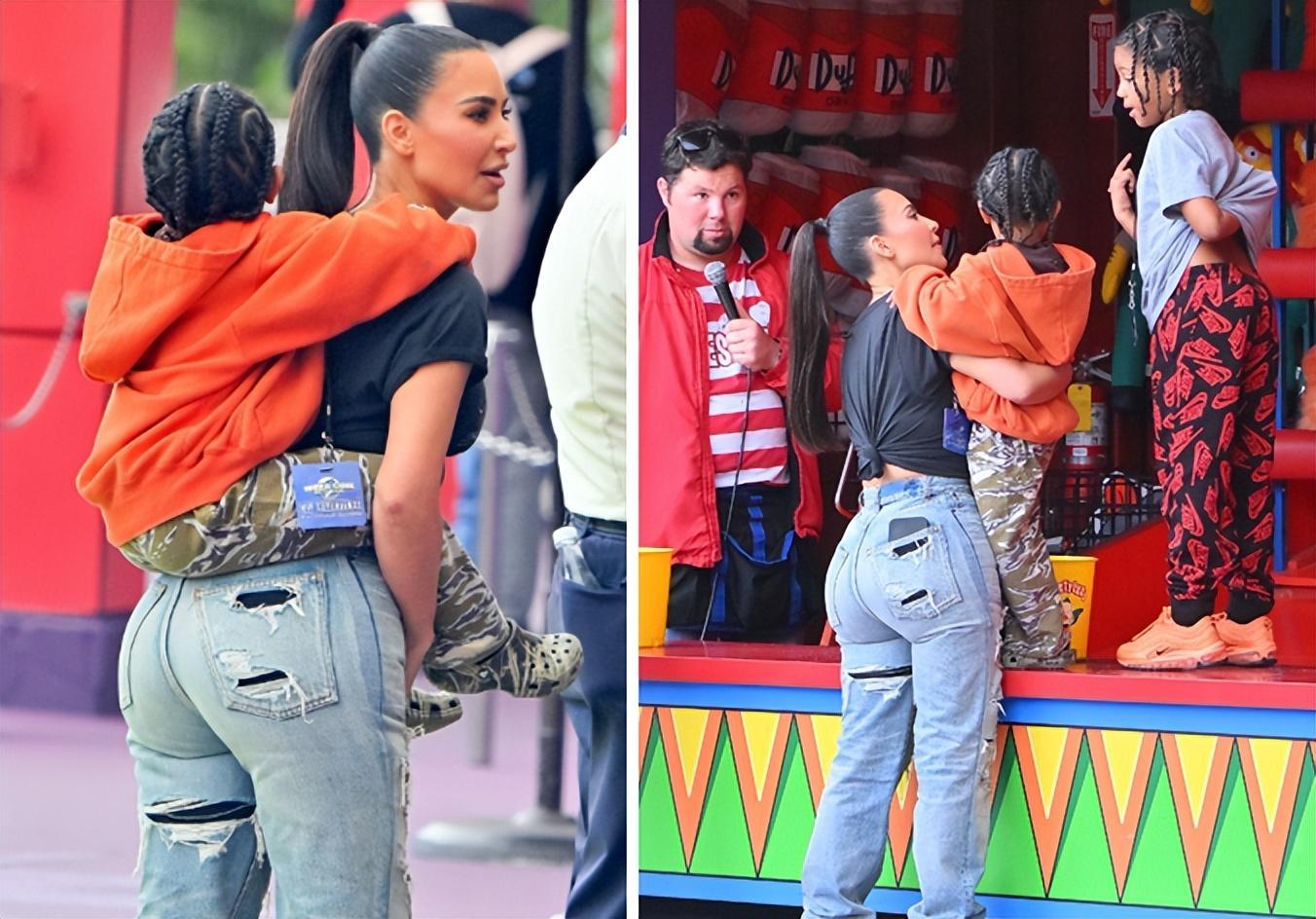 反觀金卡戴珊,除了舉辦派對,還帶着孩子去環球影城玩耍,從美國媒體拍到的照片可以看出,金卡戴珊絲毫沒有巨星架子,穿着休閒樸素,黑色T恤搭配牛仔褲,然後紮了個馬尾辮,全程陪伴兒子,很有耐心,甚至在4歲的Psalm玩累之後,金卡戴珊還主動把孩子背在背上,秀出沙漏型身材曲線,母愛感爆棚!