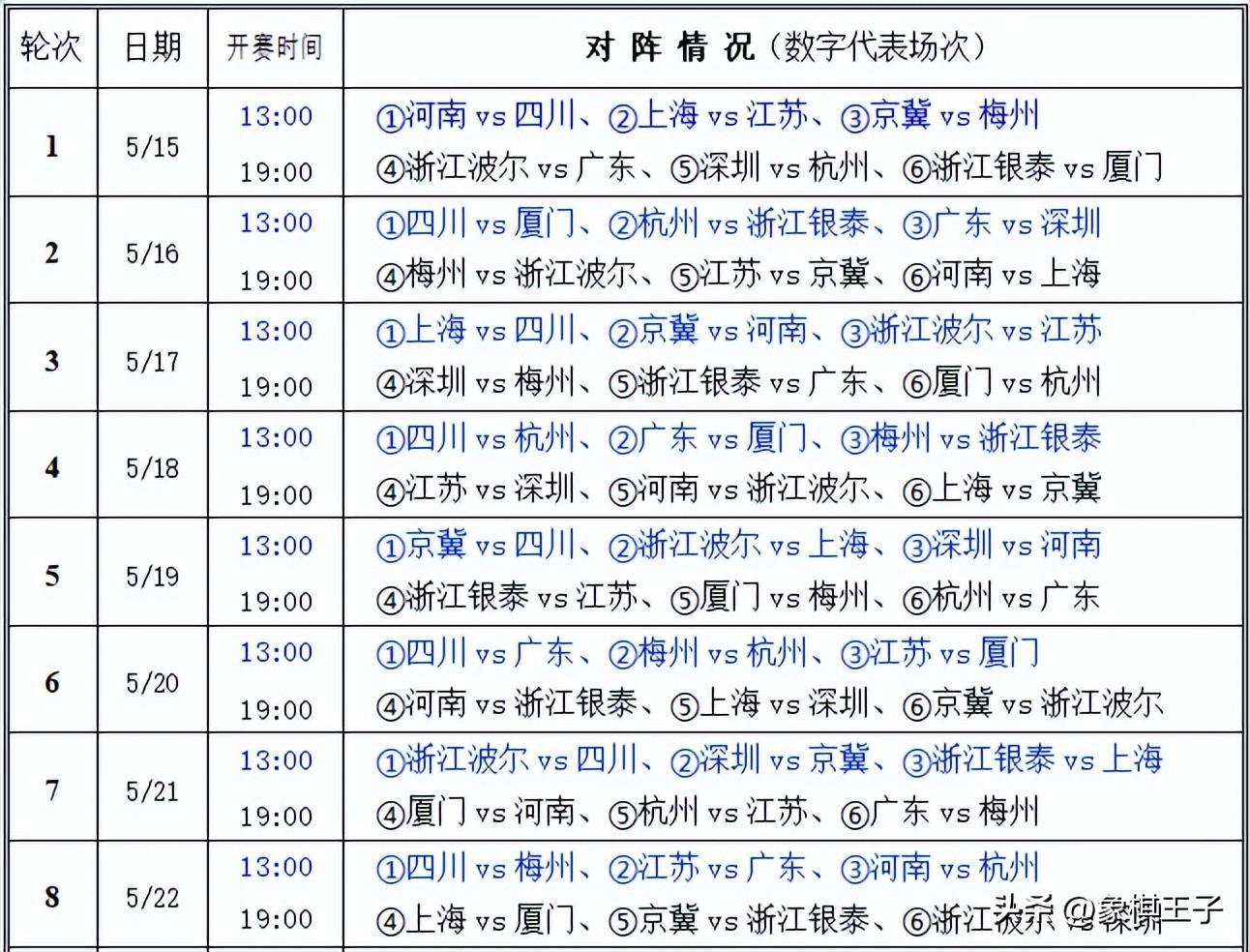 比賽日程每天下午一點、晚上七點各進行下午場和晚上場三戰,揭幕戰下午場河南對四川,上海VS江蘇,京冀-梅州,晚上場浙江波爾對廣東,深圳VS杭州,浙江-廈門。