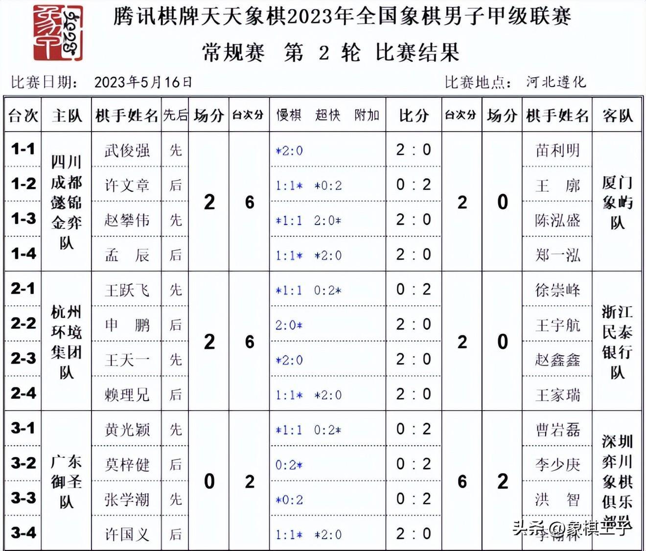 5月16日,2023年全國象甲聯賽第二輪下午場在河北遵化戰罷,王天一擊敗趙鑫鑫,賴理兄贏棋,杭州6比2浙江,獲象甲首勝,深圳、四川分別贏下廣東、廈門。晚上七點場京冀江蘇,河南上海,浙波爾梅州,象棋王子全程直播。