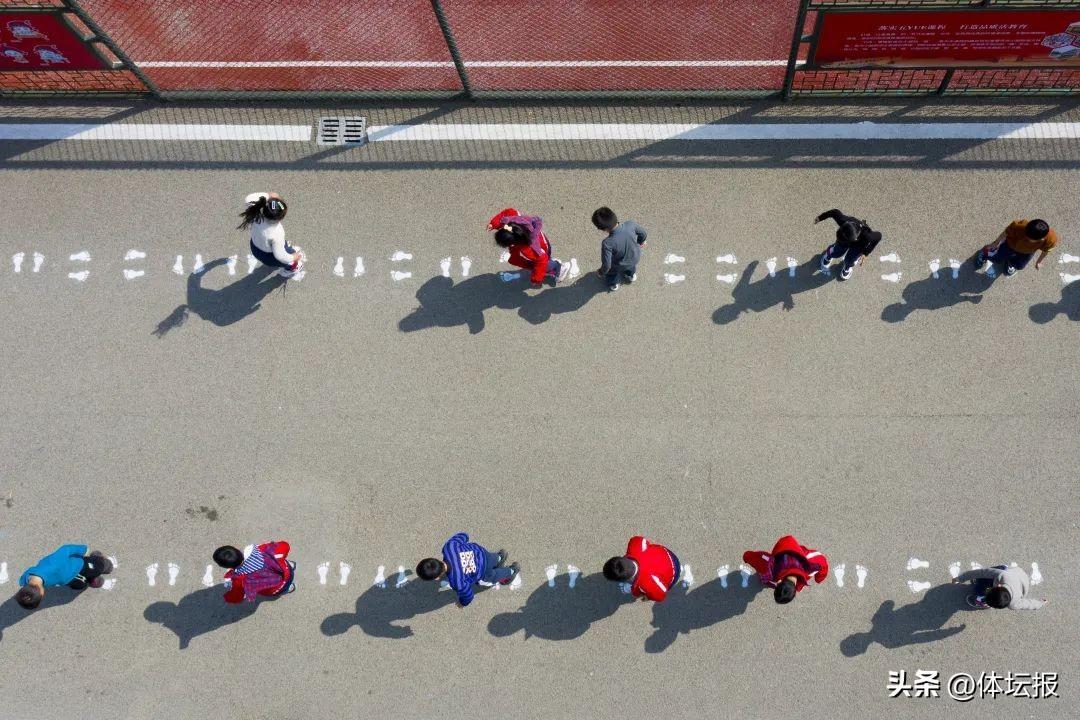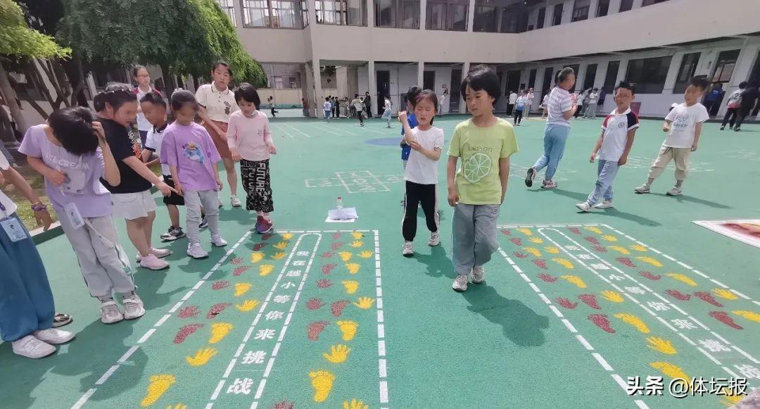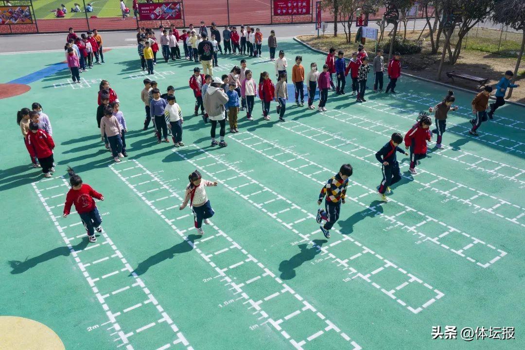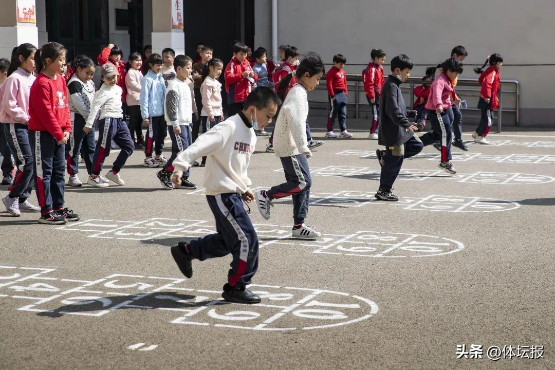 王光軍介紹,這些運動參考了傳統體育項目,並加入了校園元素。以“跳房子”爲例,根據學校實際場地,有20格的,也有短的10格的。再比如“小腳丫”項目,以裂縫爲起點,以對面的樹爲終點。每組10米,腳丫方向隨機調整。