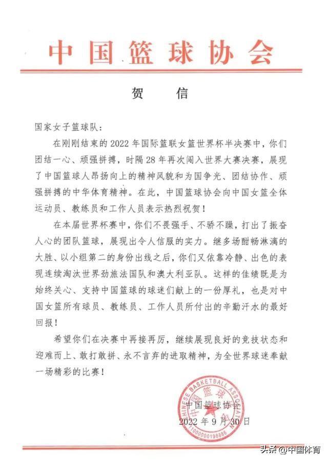 中國體育訊 在北京時間9月30晚進行的2022年國際籃聯女籃世界盃半決賽中,中國隊以61:59擊敗東道主澳大利亞隊,繼1994年女籃世錦賽(女籃世界盃前身)獲得亞軍之後再次晉級決賽。中國籃協第一時間向中國女籃發出賀信,全文如下: