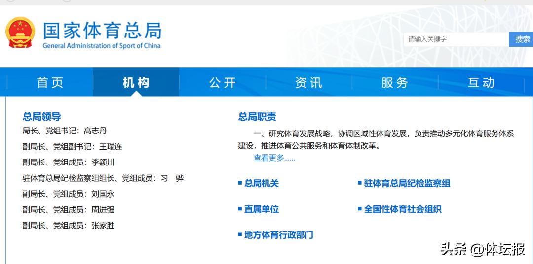 近日,國家體育總局新增一名副局長。國家體育總局官網“總局領導”一欄更新顯示,浙江省人民政府副省長、黨組成員張家勝已擔任國家體育總局副局長、黨組成員。