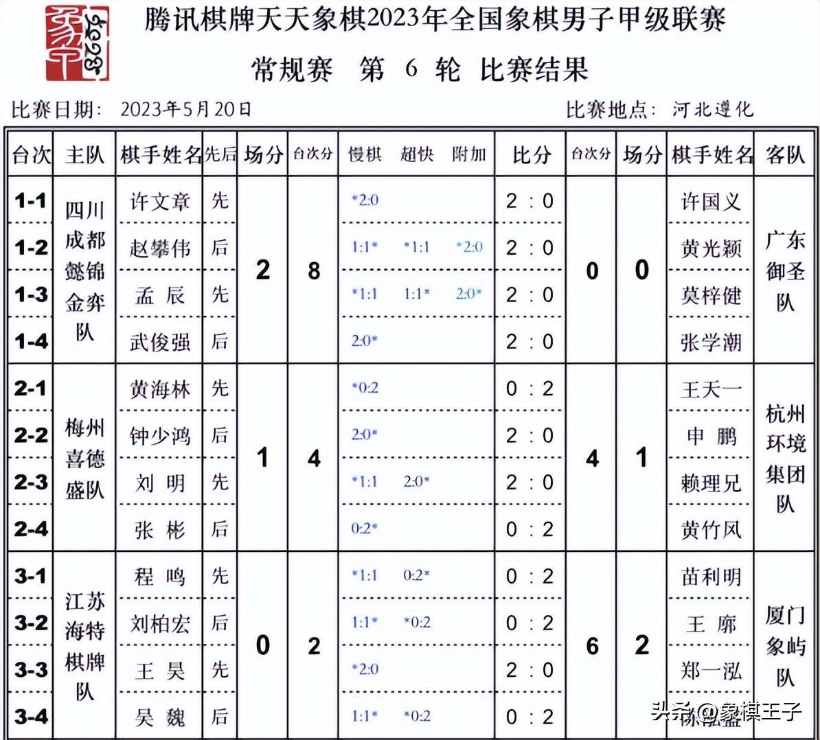 5月20日,2023年全國象棋甲級聯賽第六輪下午場的比賽在河北唐山戰罷,杭州隊意外戰平梅州隊,四川擊敗廣東,廈門取勝江蘇。晚上七點場京冀對浙江,深圳對上海,河南對浙江,象棋王子全程直播。
