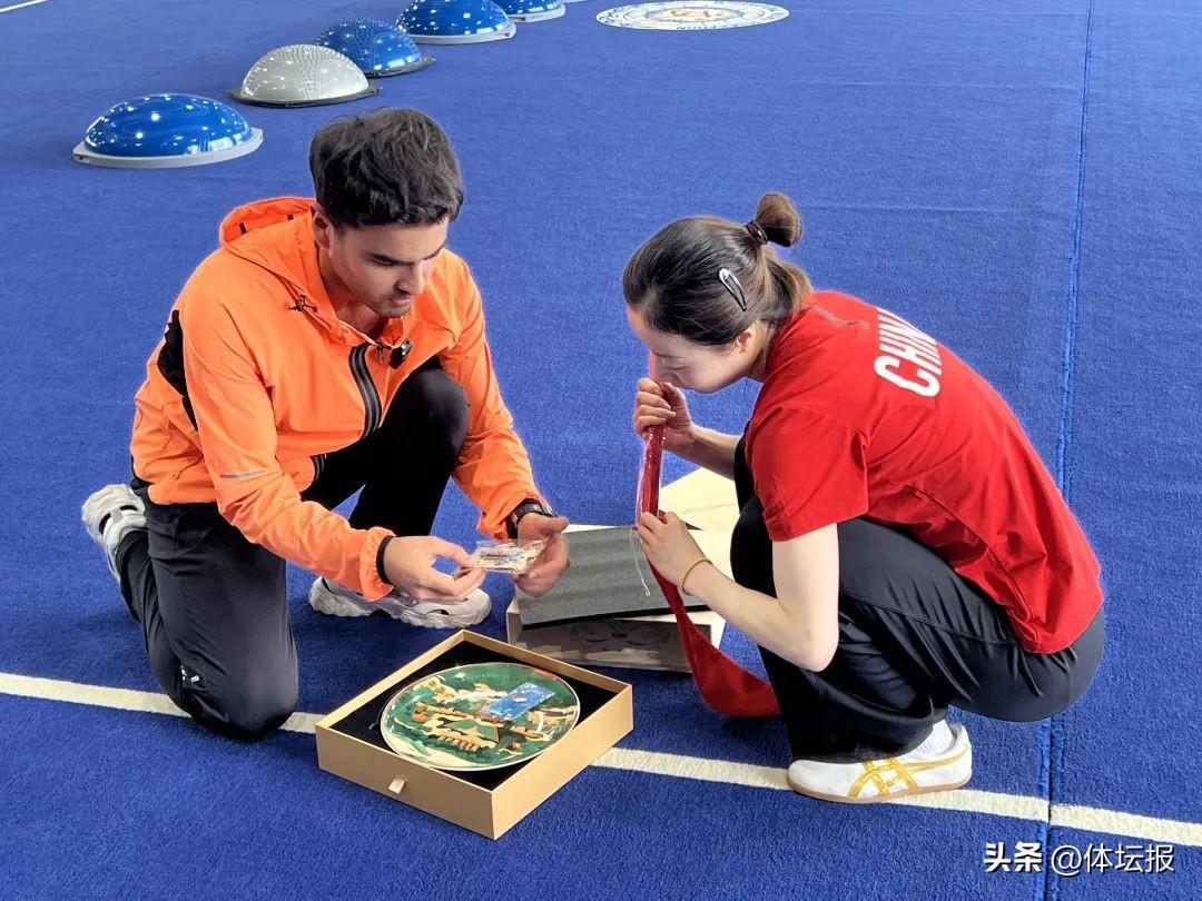 值得一提的是,本次探營,“洋主播”與世界冠軍還互相交換禮物。孟軻爲戴丹丹準備的禮物之中包括一枚中國與塔吉克斯坦兩國國旗的徽章以及一個塔吉克斯坦的冰箱貼,預示着中塔友誼長存,戴丹丹則以太極扇作爲回禮。她表示,太極扇作爲太極拳中器械的一種,是一種風格獨特的武術健身項目,平時可以用來鍛鍊身體。黛雅爲張春豔準備的也是自己國家的特色紀念品——俄羅斯套娃,張春豔則準備了一把太極劍贈予黛雅,鼓勵黛雅繼續“習武”鍛鍊身體。