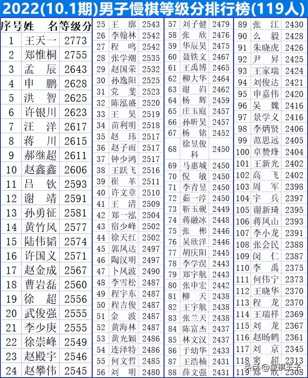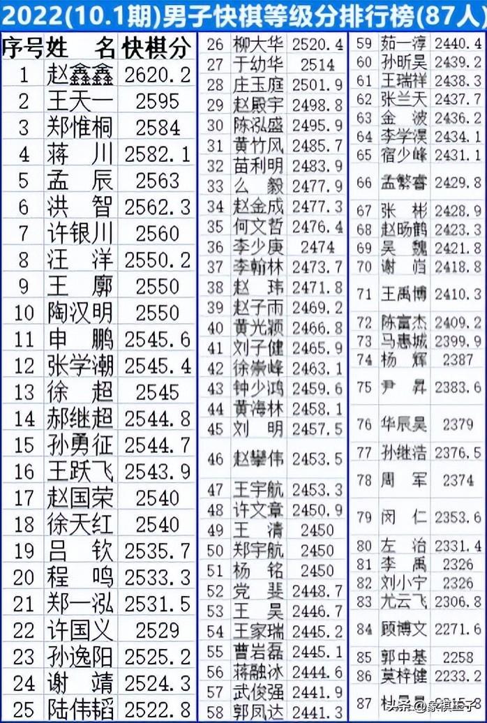 男子快棋等級分中,87將在列,第一趙鑫鑫2620.2,六脈神劍首次獲得官方等級分類全國第一人,開創歷史,王天一2595第二,鄭惟桐2584第三,蔣川2582.1第四,孟辰2563第五。
