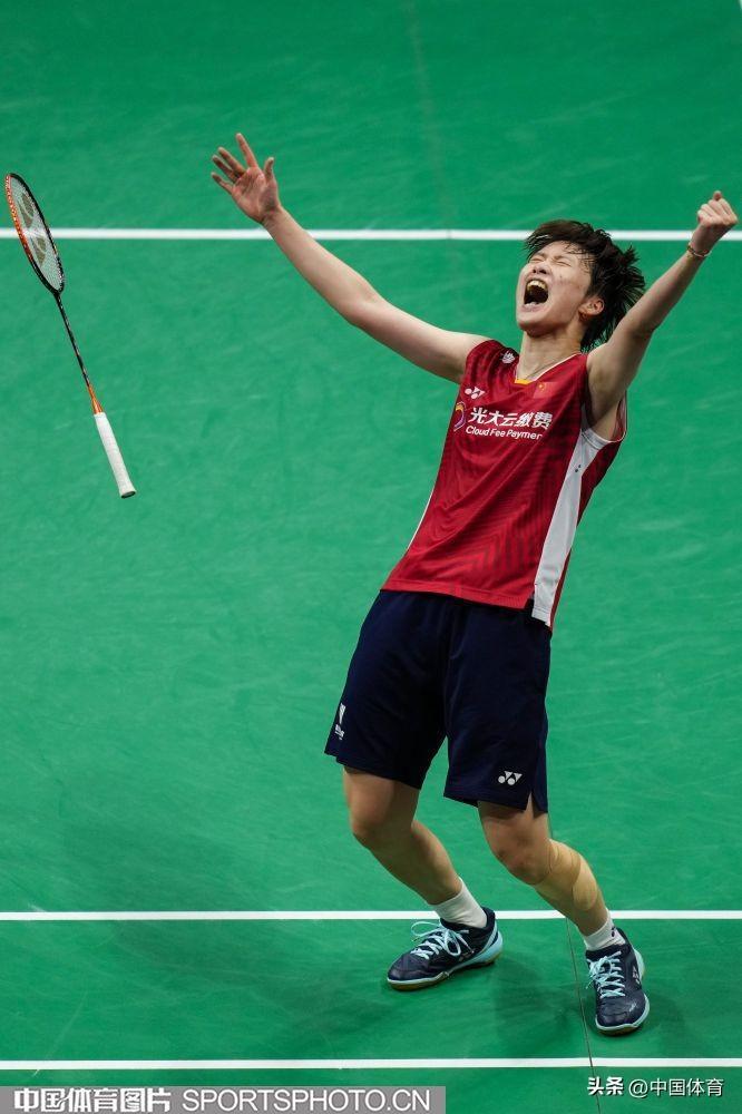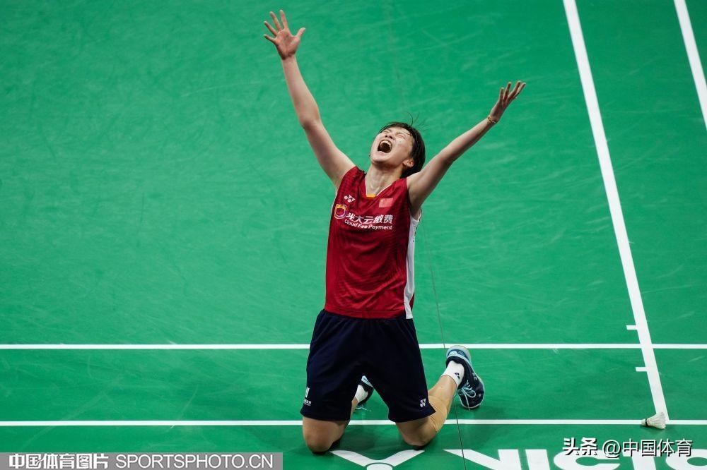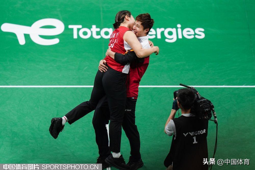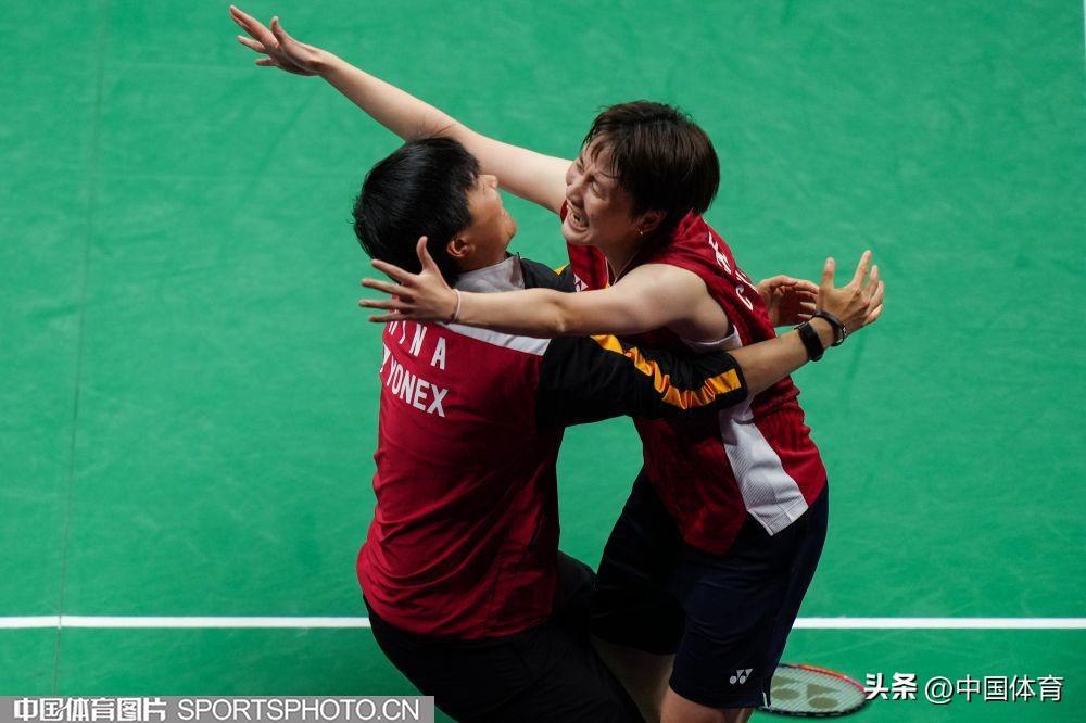 女單選手陳雨霏(右)與隊友擁抱慶祝奪冠