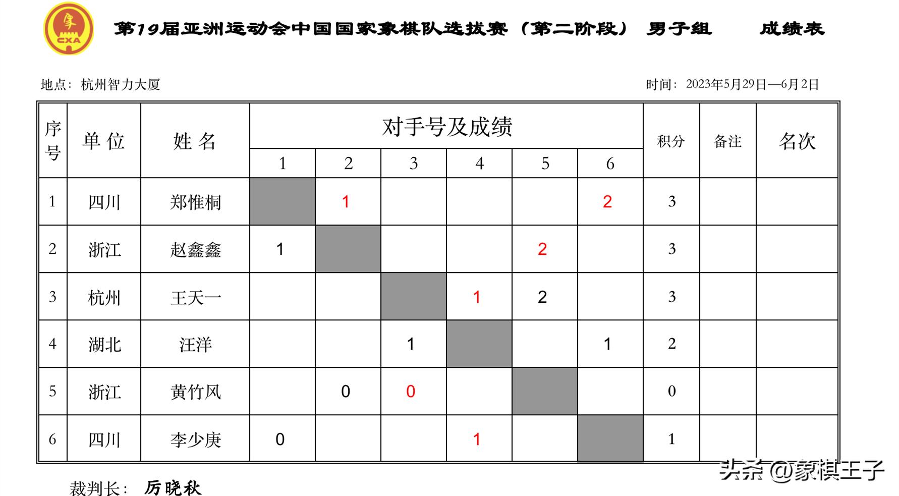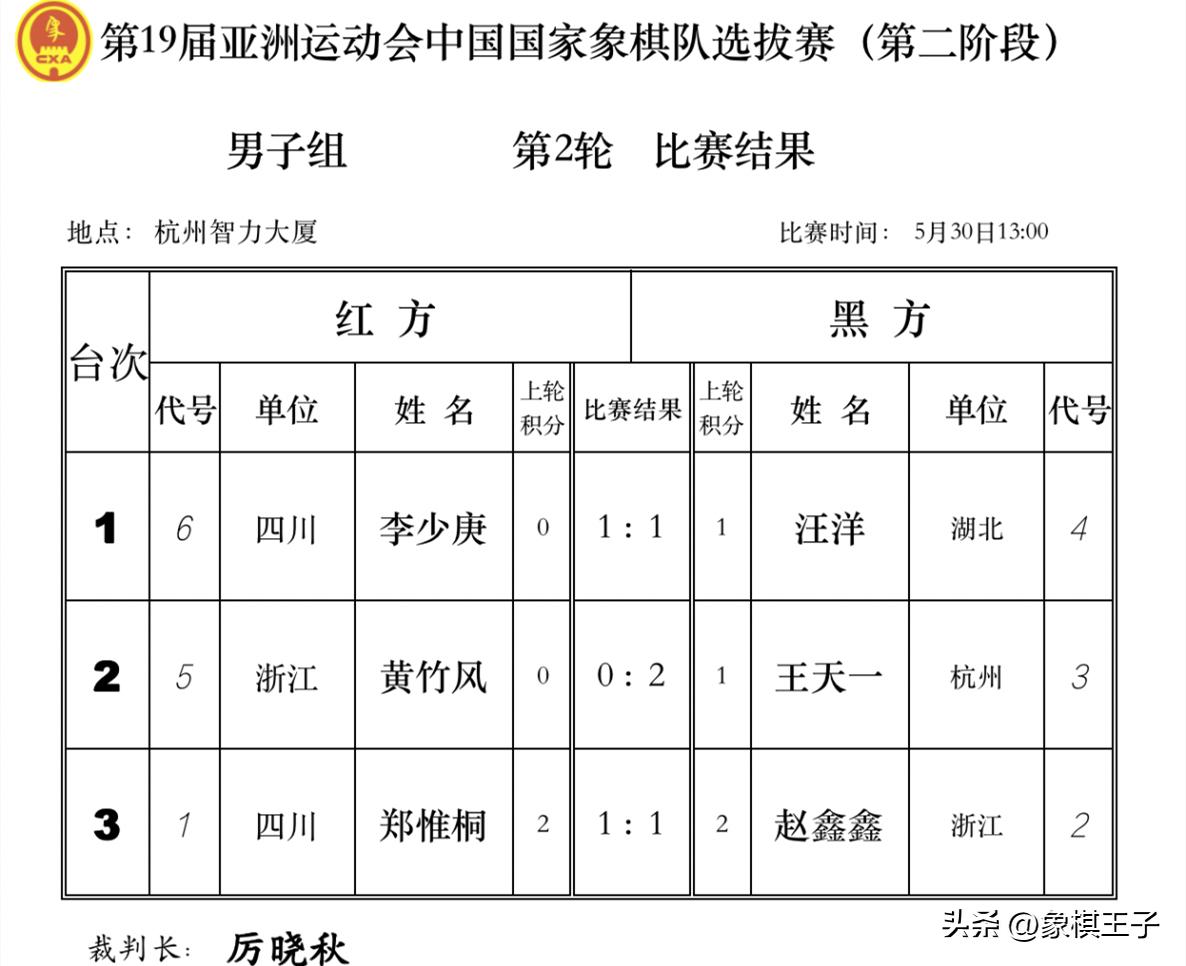 王天一對攻強勢拿下,男子兩輪後,王天一、鄭惟桐、趙鑫鑫三人3分,汪洋2分,李少庚1分,黃竹風0分。