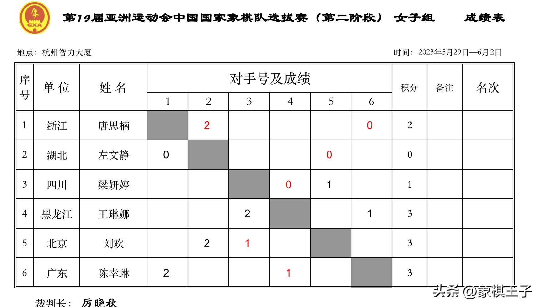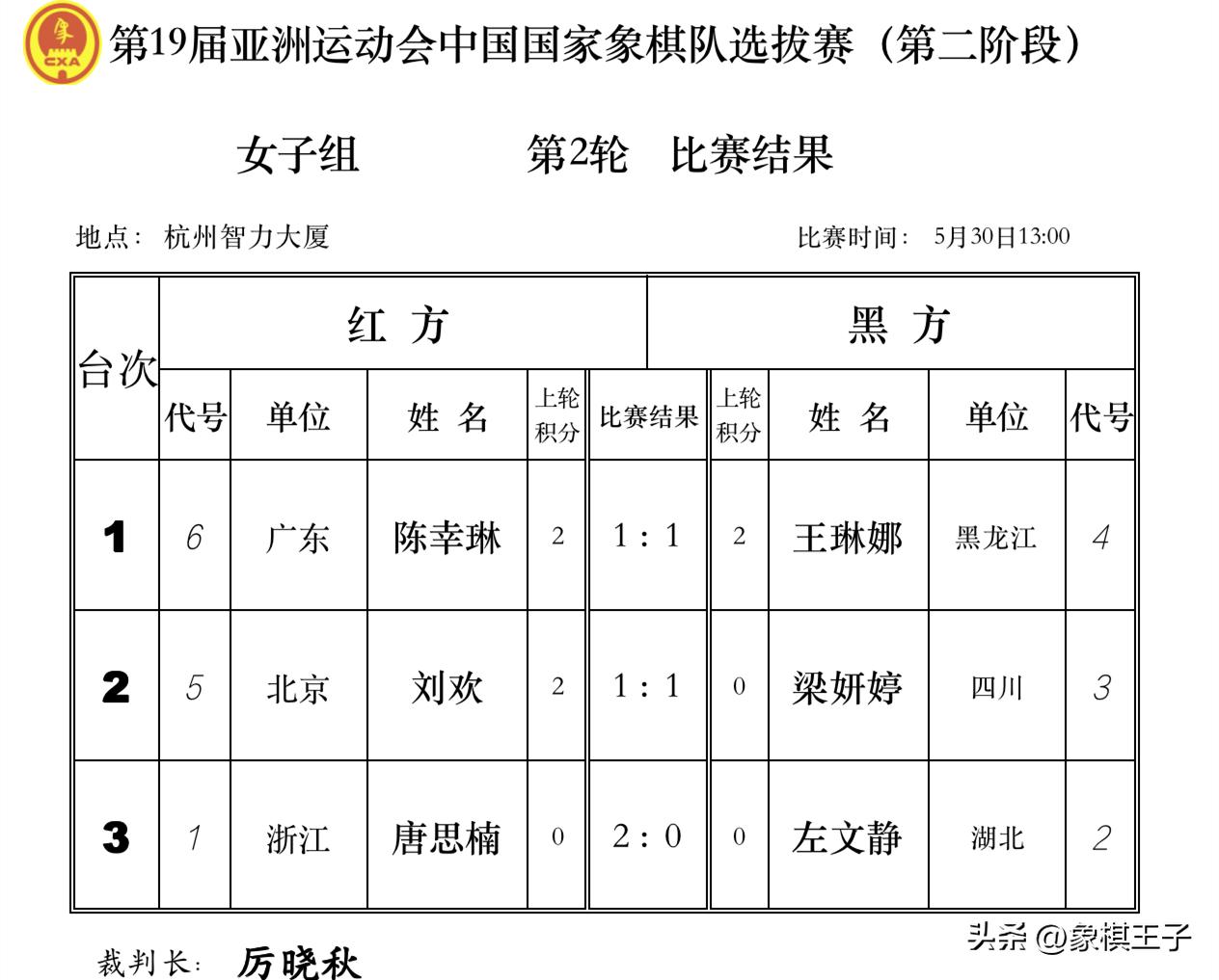 女子二輪後,王琳娜、陳幸琳、劉歡3分,唐思楠2分,梁妍婷1分,左文靜0分。