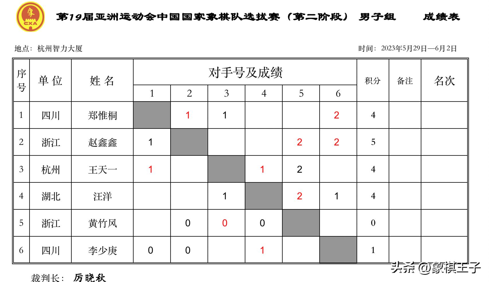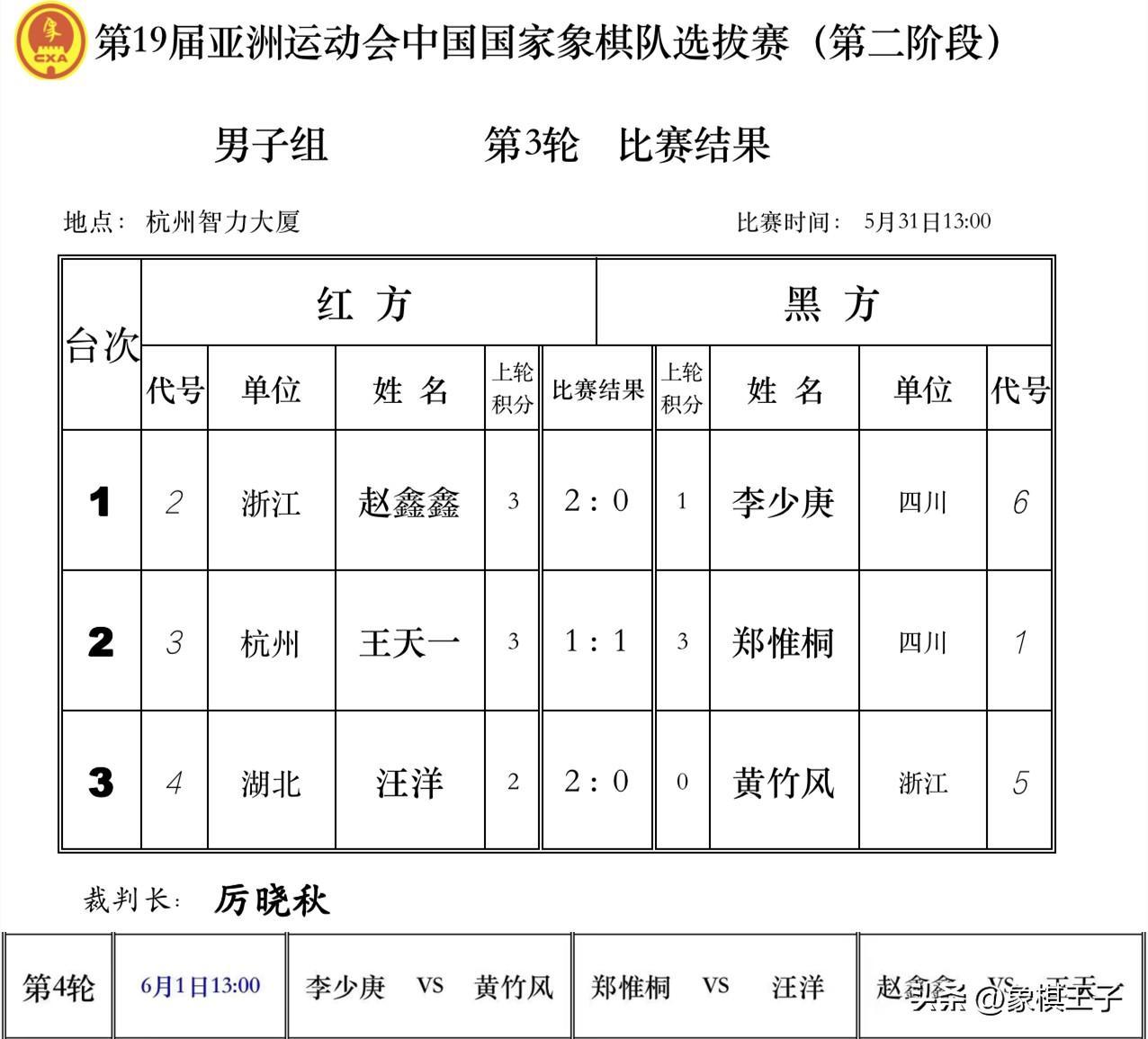 三輪下來,趙鑫鑫5分,王天一、鄭惟桐、汪洋4分,四大高手,成爲四進三的排位,李少庚1分、黃竹風0分已然出局。