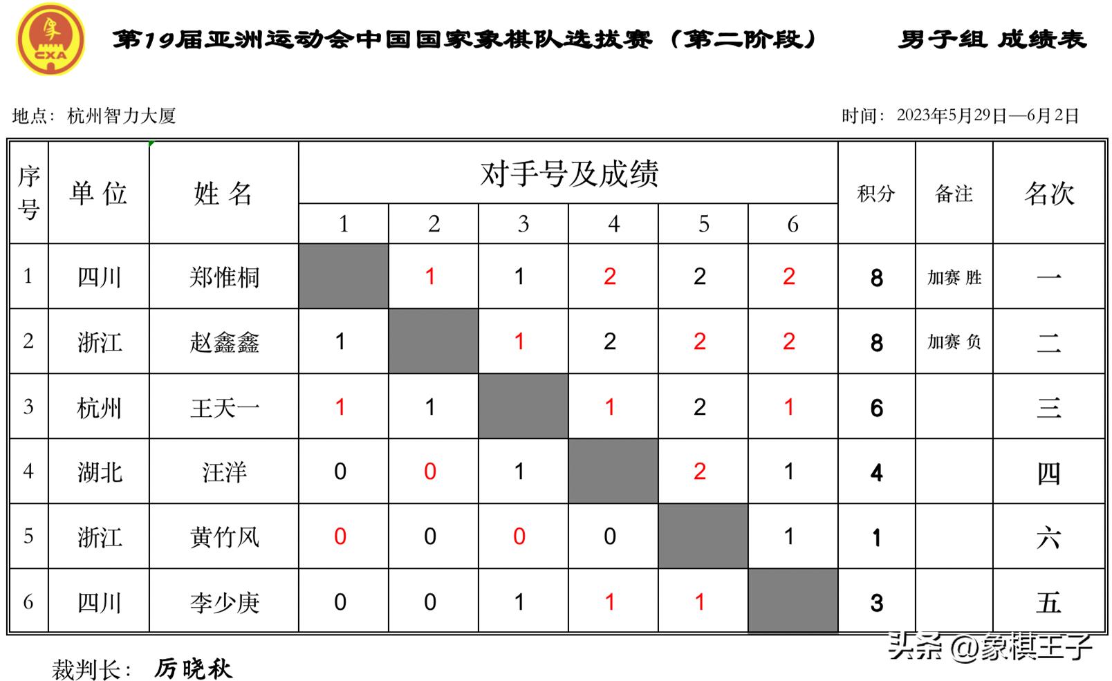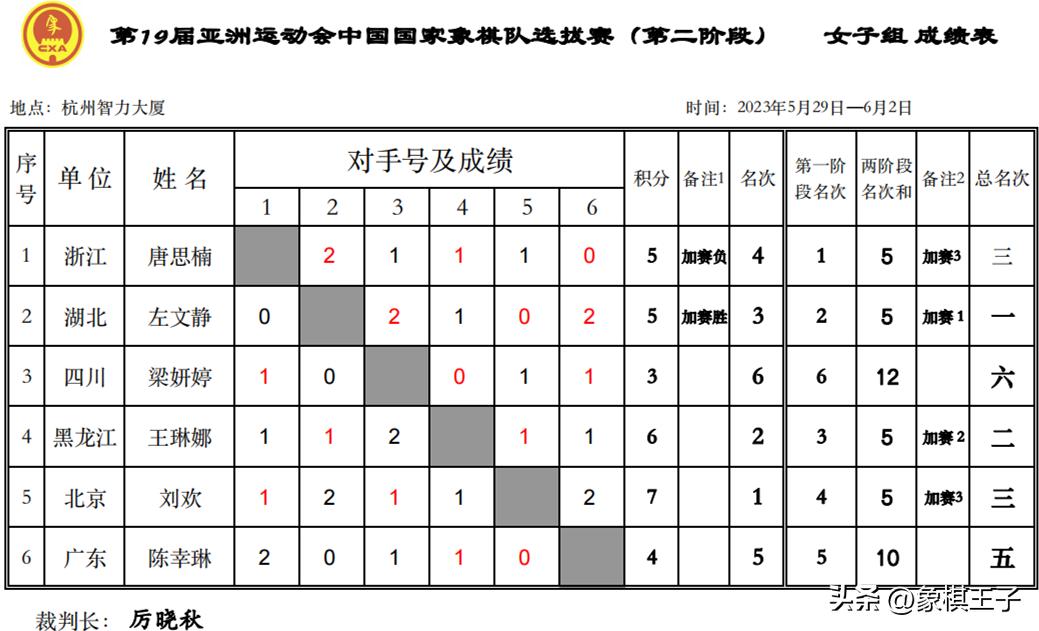 此番第二階段選拔,從5月29日持續至6月2日,王天一、鄭惟桐、趙鑫鑫、汪洋、黃竹風、李少庚,六位男子好手,王琳娜、陳幸琳、劉歡、唐思楠、左文靜、梁妍婷,6巾幗,各五輪單循環比拼。