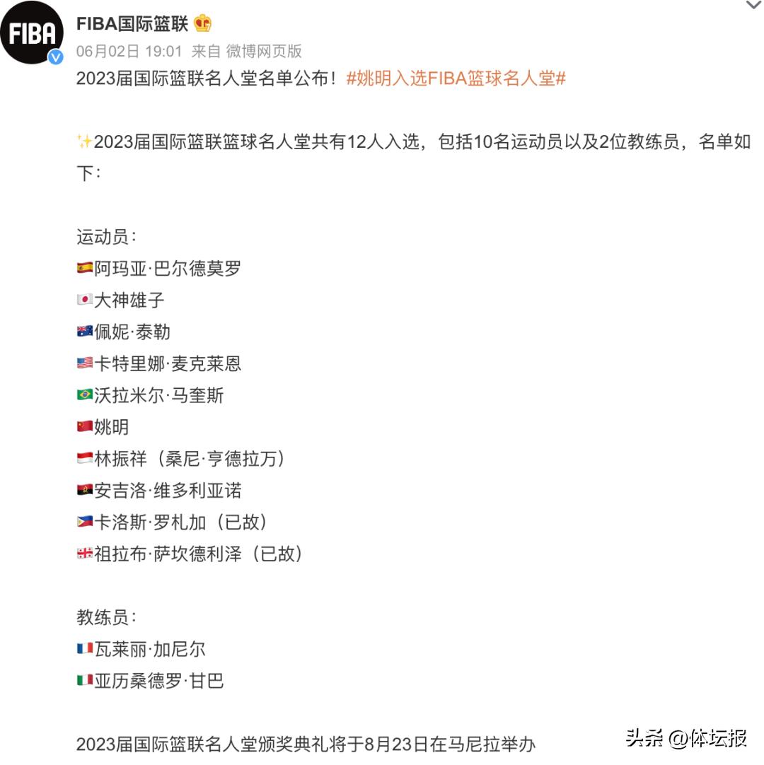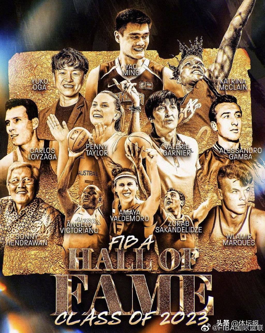 國際籃聯當日公佈了入選2023年國際籃聯名人堂的12人名單,包括10名運動員和2名教練員。