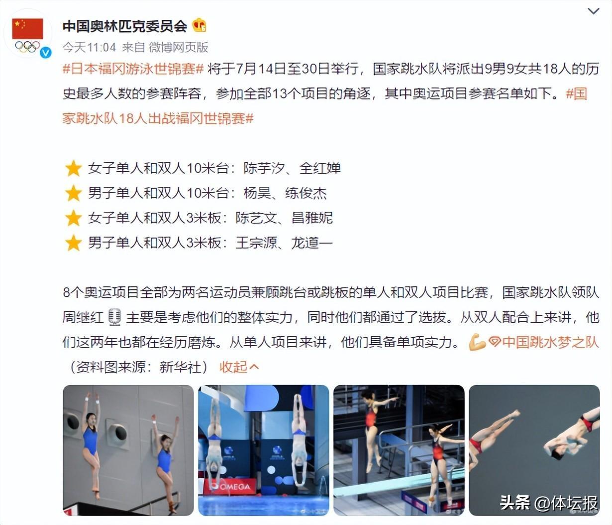 本次出征的中國跳水隊共18名運動員。領隊周繼紅6月7日表示,在去年的布達佩斯世錦賽上中國跳水隊包攬了13枚金牌,福岡若想續寫輝煌面臨一定的挑戰。