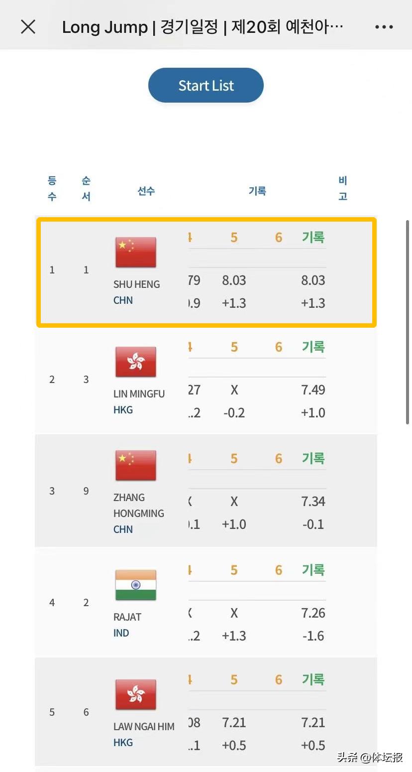 6月7日,在韓國舉行的第二十屆亞洲U20田徑錦標賽上,浙江小夥舒衡以8.03米的成績奪得跳遠冠軍,爲中國隊斬獲一枚金牌,並達到國際健將標準。