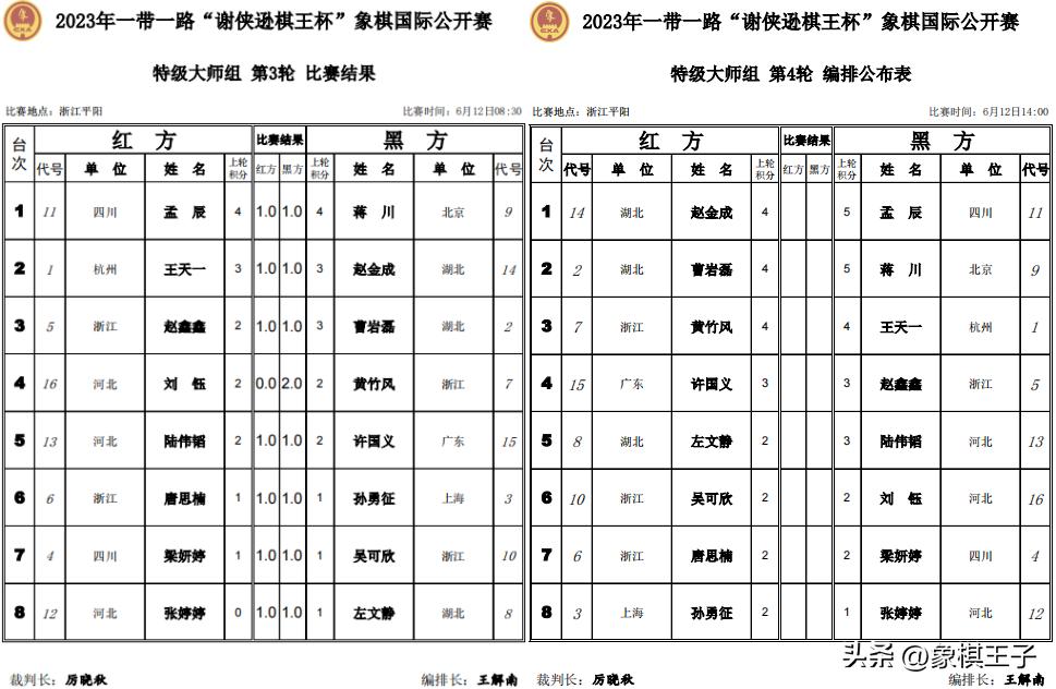 6月12日,2023年謝俠遜棋王杯象棋國際邀請賽第三輪比賽在浙江平陽戰罷。特大組黃竹風執後手擊敗女將劉鈺,是輪唯一分勝負局,其他戰平,三輪後蔣川孟辰5分,王天一曹巖磊趙金成黃竹風4分。公開組程宇東發揮出色,前六輪五勝一平,11分單騎領先,鄭一泓、吳魏、徐崇峯、孫逸陽、劉子健、王昊、姚洪新10分。
