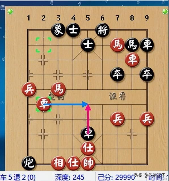 黑棋擋住了紅方的左路奔槽,被迫送象,然而無法阻止紅的右翼奔襲,只能左邊車馬強頂。
