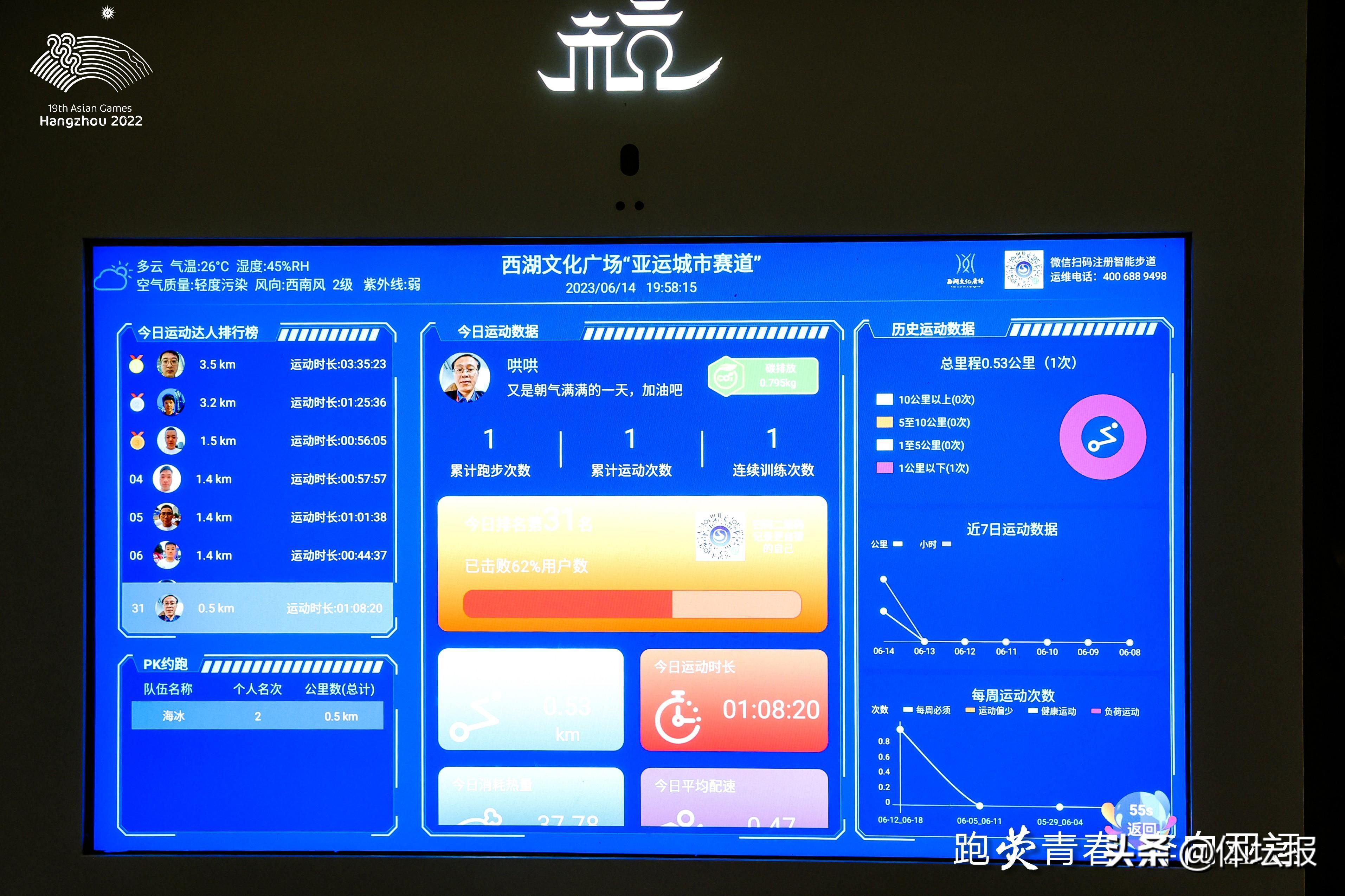 記者瞭解到,“亞運城市賽道”全長500米,融合應用了視覺識別、射頻識別、雲計算等技術,現場市民朋友們可以通過在起點處的數智運動信息大屏上傳人臉註冊。“開跑後,沿途的數據採集柱會利用高端定製的AI運動專用攝像頭抓拍,將運動數據秒傳上報,路上的陪跑燈也會隨着人行一路感應照明,增加用戶的戶外趣跑體驗。”工作人員介紹,運動結束後,沿途採集的數據會被記錄並顯示在該互動屏或小程序上,比如消耗了多少熱量、運動里程當日的運動時長以及歷史運動信息都可以一目瞭然,使全民健身實現大數據可視化。此外,市民們還能通過小程序約跑PK,與周圍市民拉近距離。