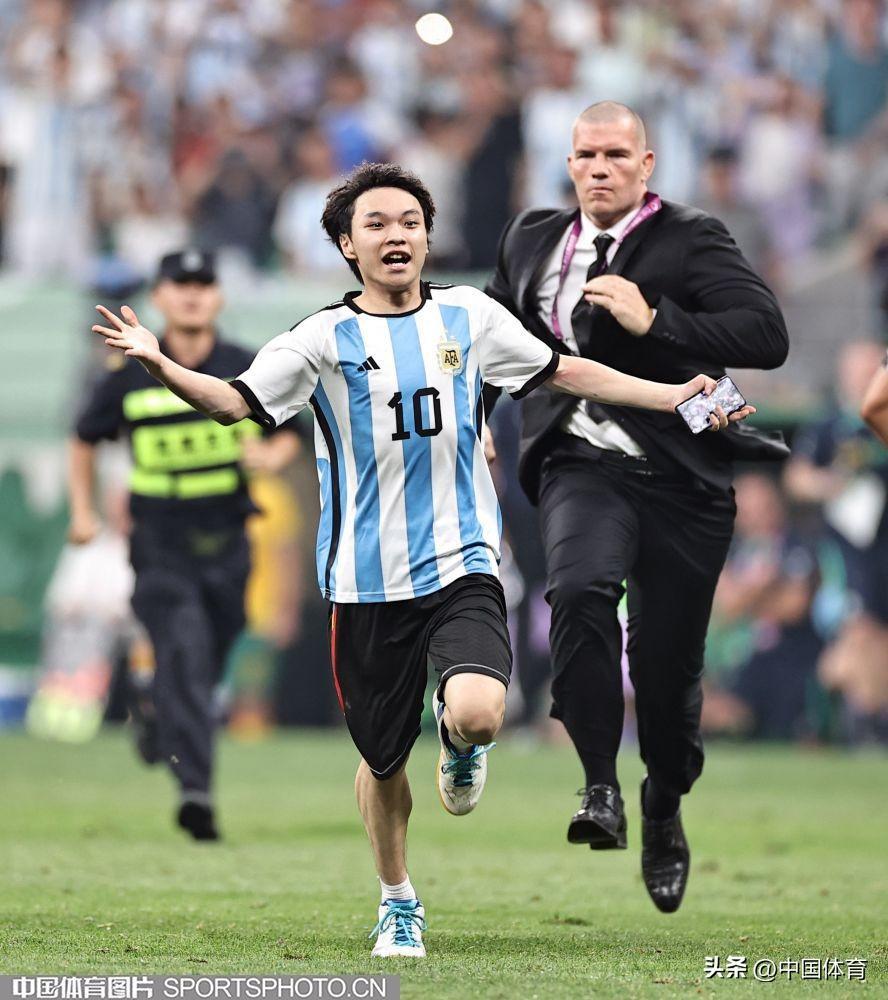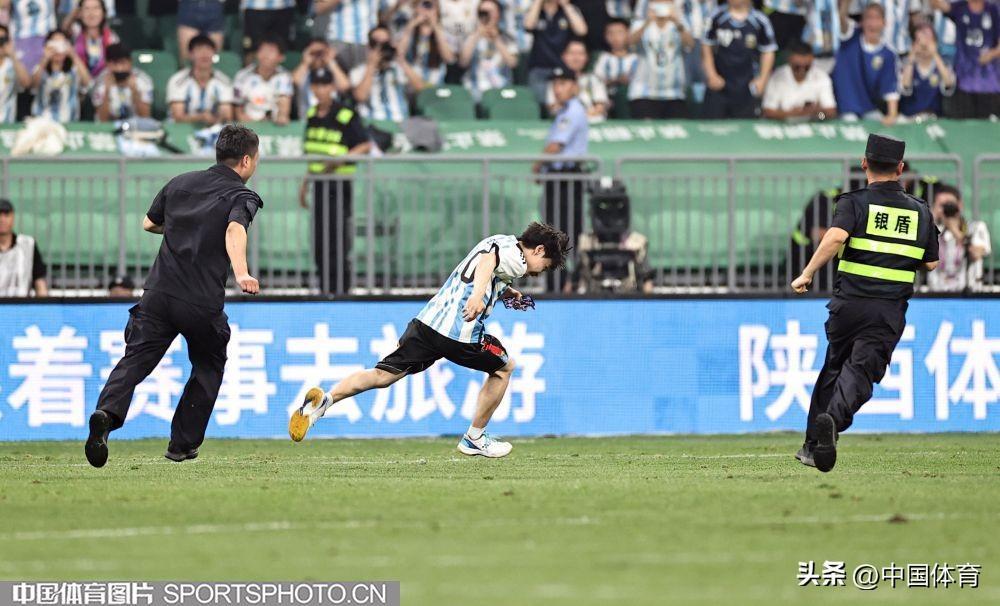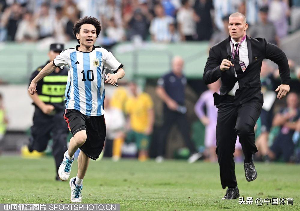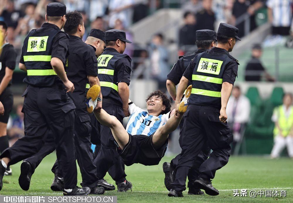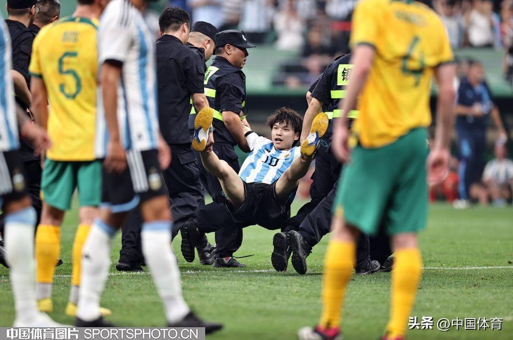 中國體育訊 6月15日晚,在北京工人體育場舉辦的國際足球邀請賽中,阿根廷隊以2比0戰勝澳大利亞隊。比賽期間,一位狂熱球迷闖入賽場試圖擁抱阿根廷球星梅西,被工作人員抬走。(中國體育圖片 王憲民 攝)