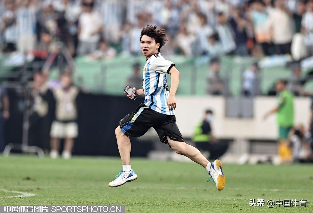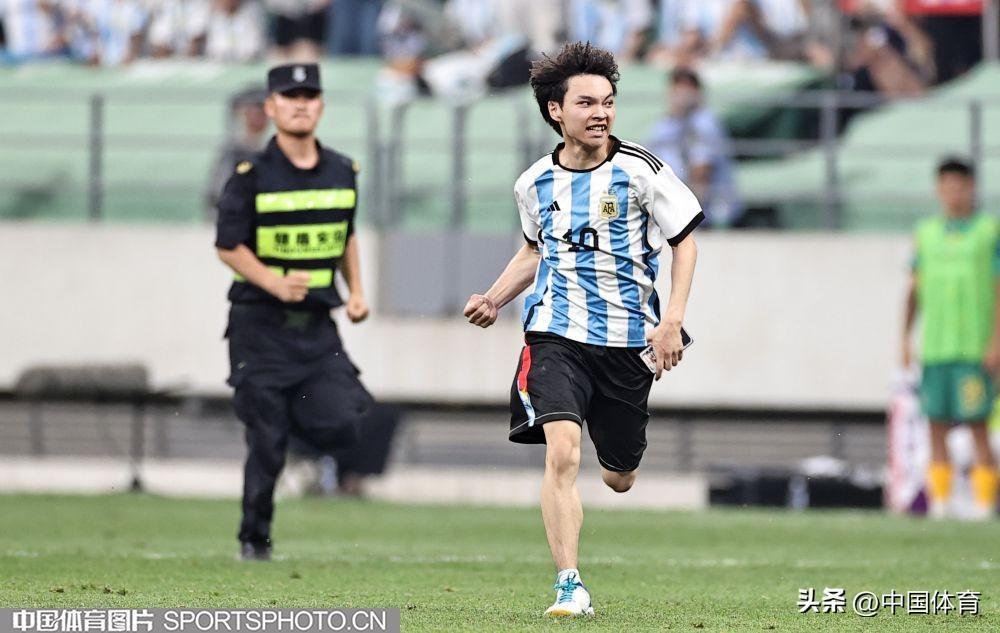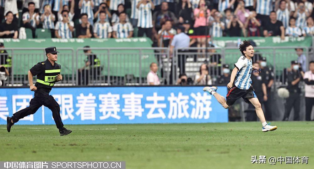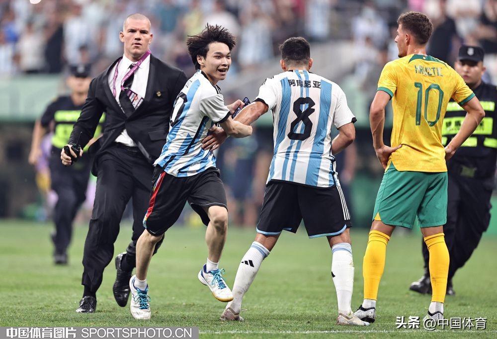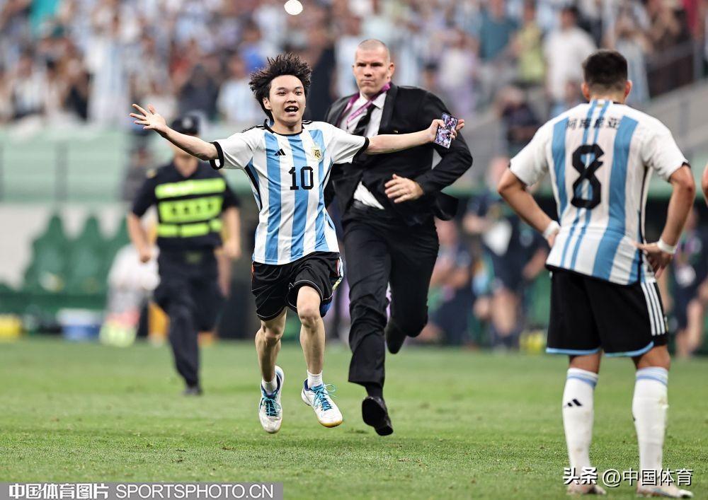 中國體育訊 6月15日晚,在北京工人體育場舉辦的國際足球邀請賽中,阿根廷隊以2比0戰勝澳大利亞隊。比賽期間,一位狂熱球迷闖入賽場試圖擁抱阿根廷球星梅西,被工作人員抬走。(中國體育圖片 王憲民 攝)