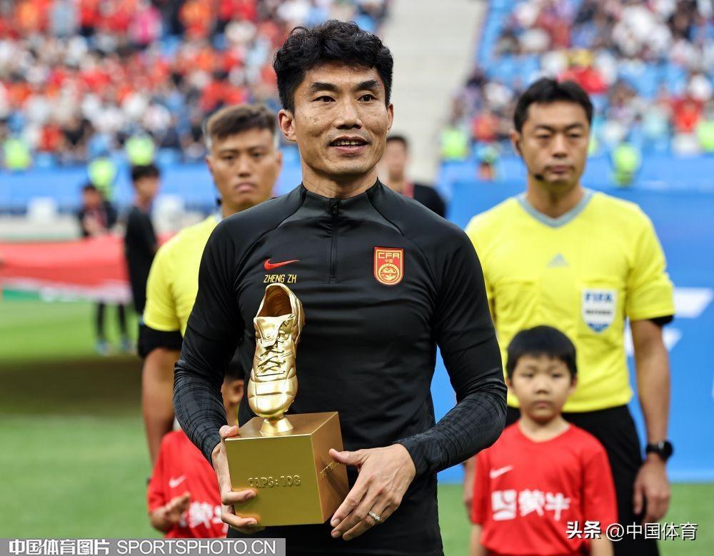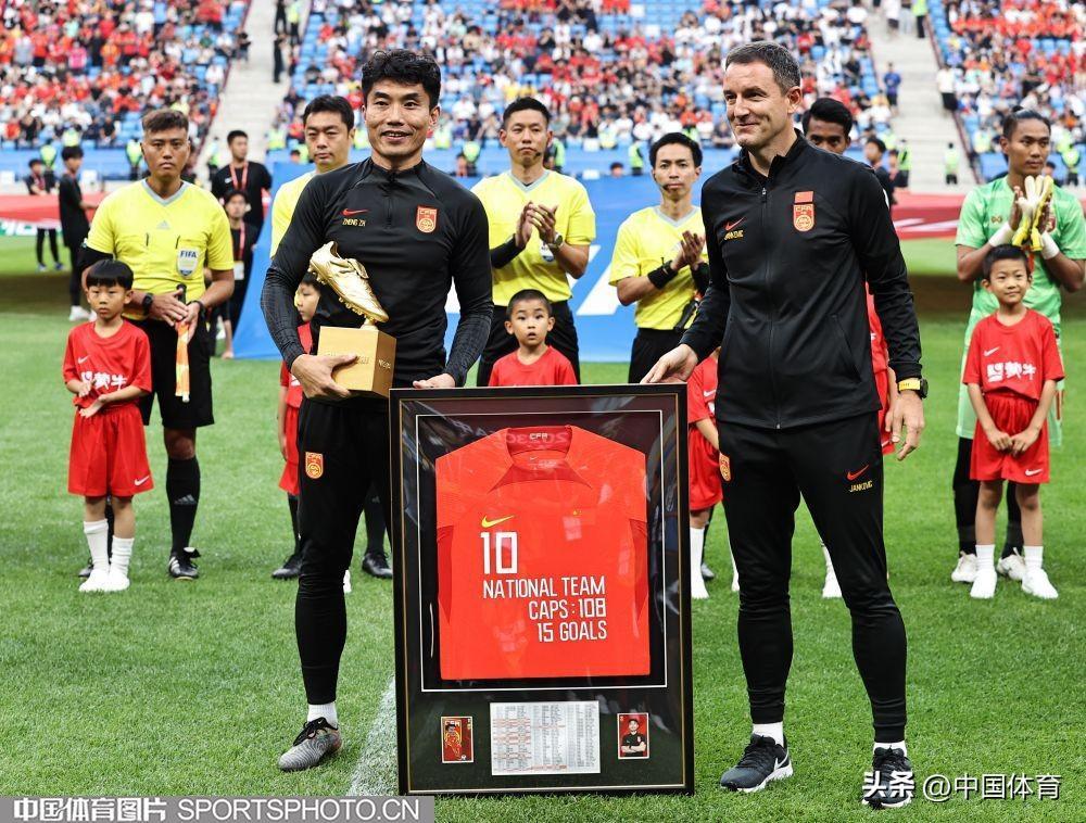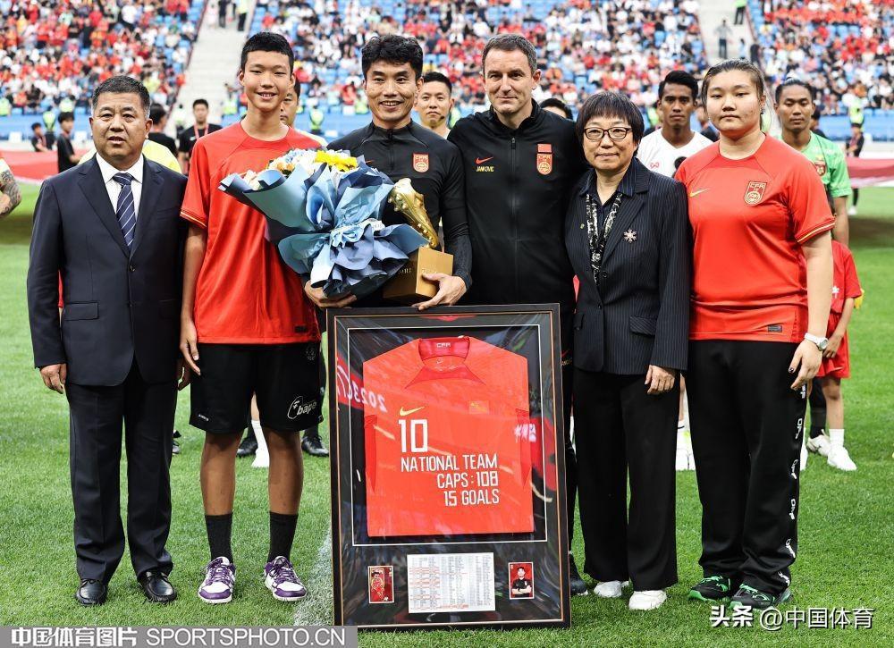 中國體育訊 6月16日晚,中國之隊國際足球邀請賽中國男足VS緬甸男足一戰在大連梭魚灣足球場上演。賽前,中國足協爲國足功勳隊長鄭智舉行了退役儀式,足協副主席孫雯出席退役儀式,併爲這位“足球老兵”頒發特製獎盃。中國隊主教練揚科維奇爲其送上一件印有數字108的特製球衣,代表他爲國家隊出場了108場比賽。近年來,中國足協一直堅持爲效力過國家隊的退役球員舉行退役儀式或者頒發退役球衣,旨在增加國腳們爲國足效力的儀式感和榮譽感。(中國體育圖片 王憲民 攝)