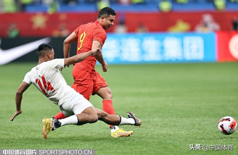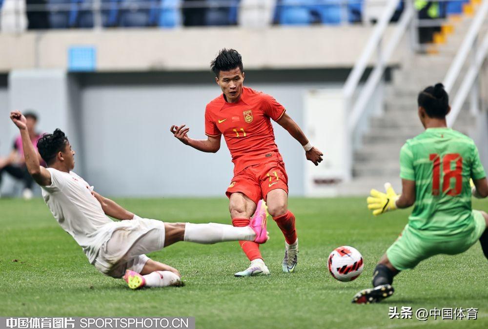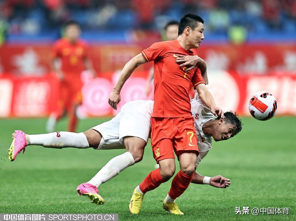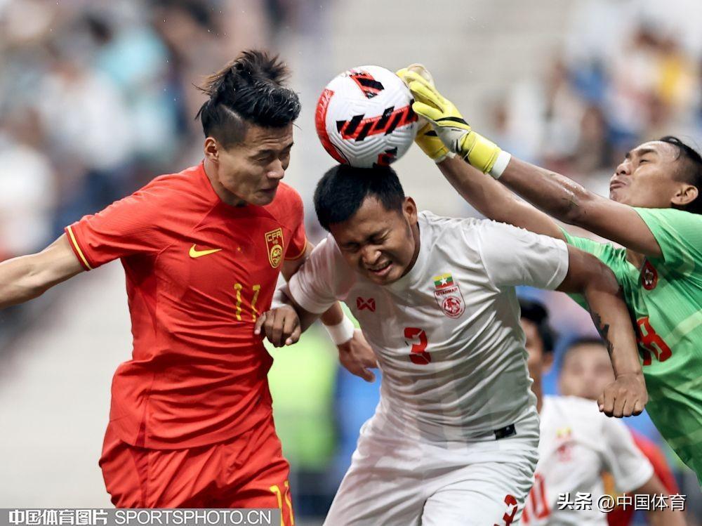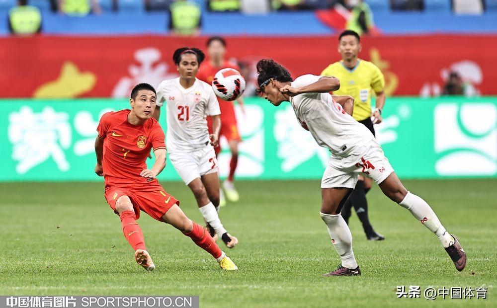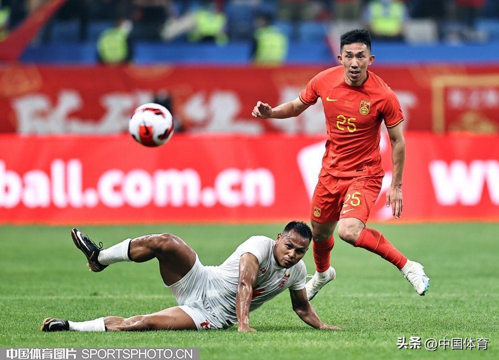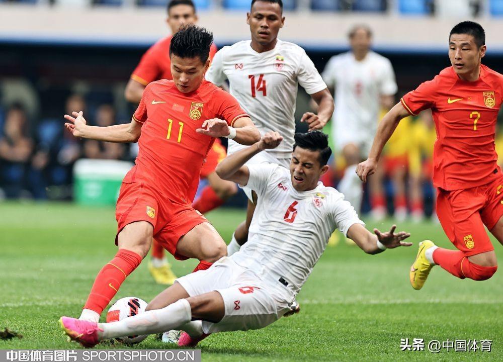 中國體育訊 6月16日晚,中國之隊國際足球邀請賽中國男足在大連梭魚灣足球場上演。坐鎮主場的中國男子足球隊(紅衣)以4比0完勝緬甸男子足球隊(白衣)。上半場,張琳芃、林良銘各進一球;下半場,武磊梅開二度。(中國體育圖片 王憲民 攝)