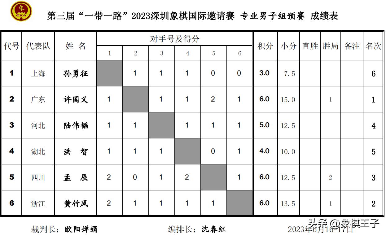 2023年第三屆“一帶一路”深圳象棋國際邀請賽的現場,專業男子組,五輪單循環預賽下來,許國義、黃竹風、孟辰同爲6分。
