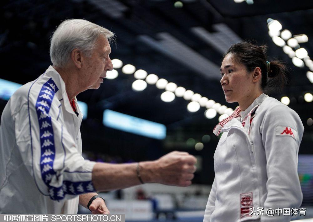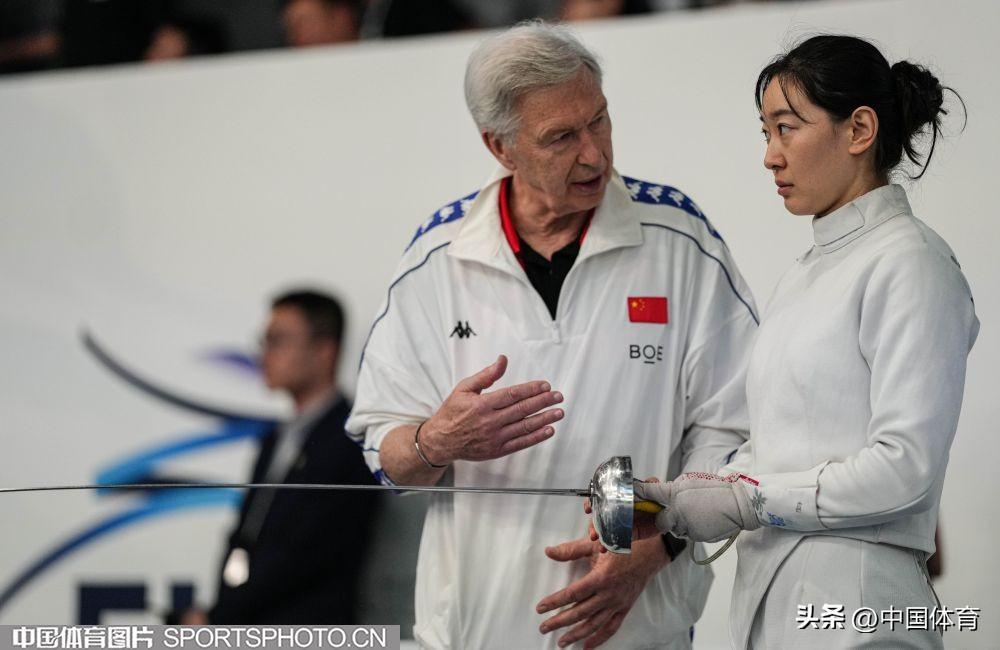 中國隊教練員勒瓦瓦瑟(左)爲孫一文講解技術