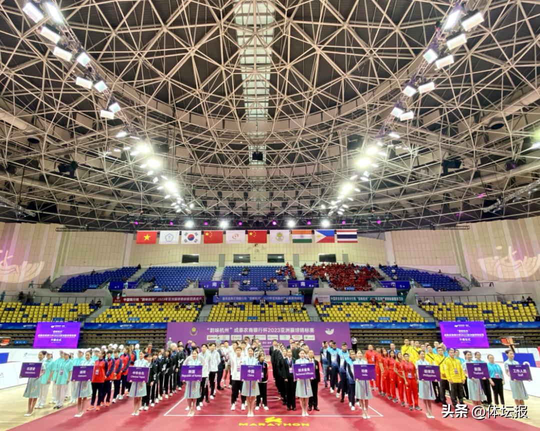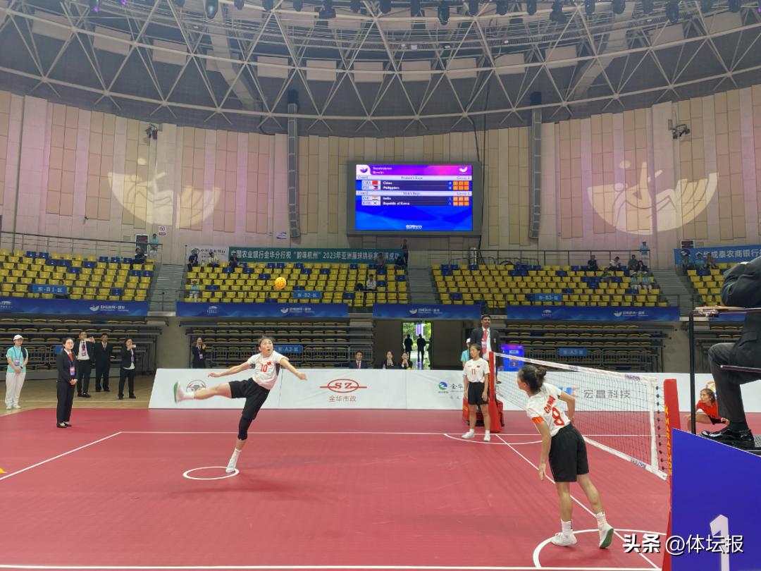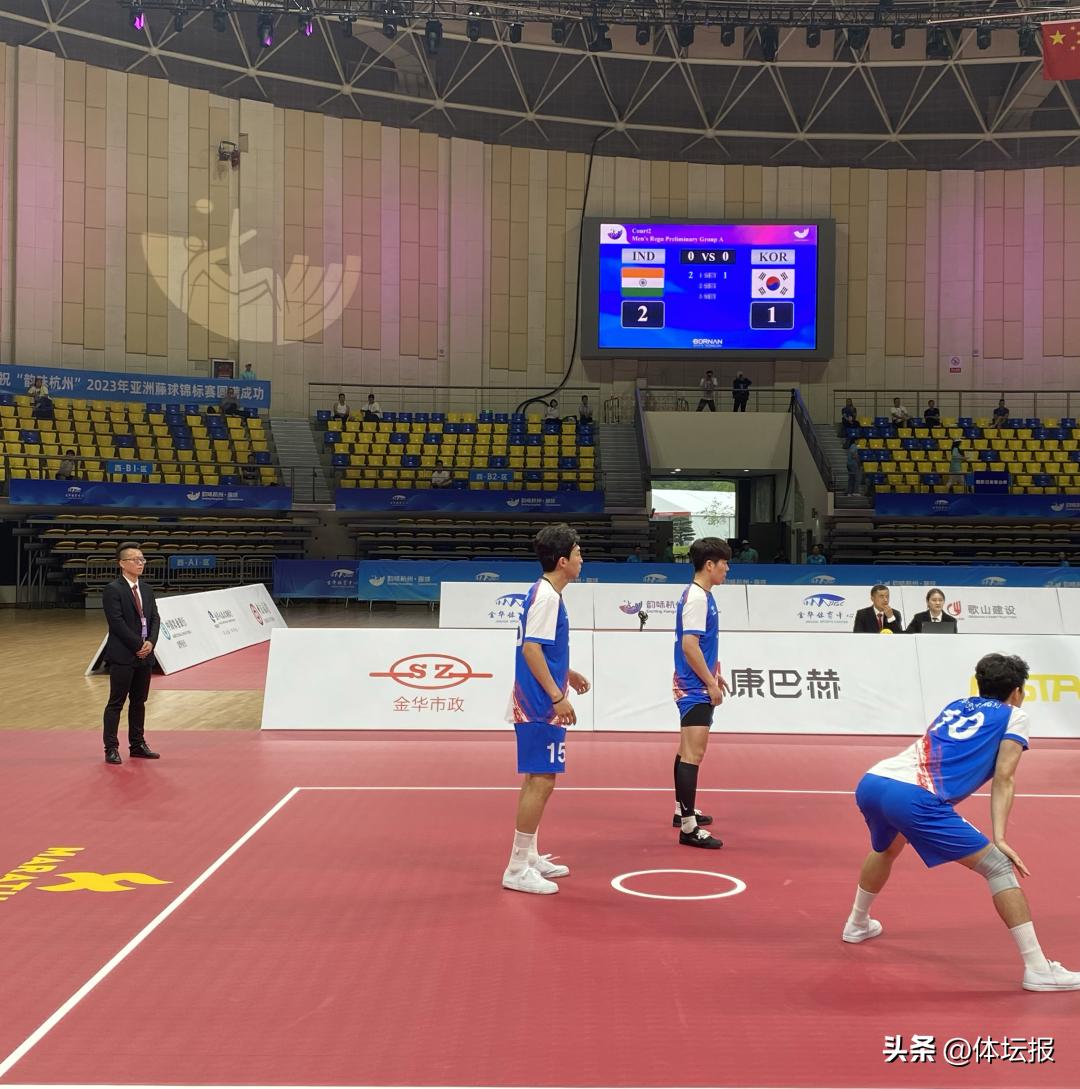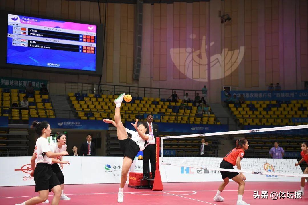 這是6月20日在金華體育中心體育館上演的一幕。中國、泰國、印度、韓國等7個參賽代表團以及技術官員齊聚於此,拉開了“韻味杭州”亞洲藤球錦標賽的序幕,未來幾天這裏將上演24場激烈比賽。