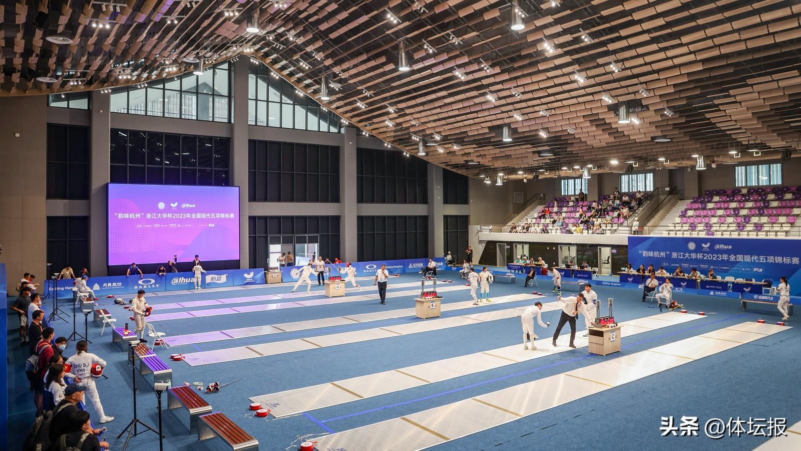 現代五項由馬術、擊劍、游泳、跑步和射擊5個項目組成,分爲個人賽和接力賽兩種形式。在比賽中,運動員不僅要掌握擊劍、馬術、游泳、長跑的技術和體能,還要具備跑步後馬上停下來射擊的穩定性,對綜合素質要求非常高,因此,現代五項也被稱爲“最完美運動”。過去,各個項目一般在分館進行。到決賽時,5個項目比下來要花上一天時間。但在東京奧運會後,現代五項的規則進行了調整,國際五項聯盟建議將決賽縮短在90分鐘內完成。因此,“五合一”場地成爲了最佳方案,而富陽銀湖體育中心的五項“五合一”場地是目前國內現存的唯一一塊此類場地。這樣“五合一”的場地,讓看臺的觀衆們將所有5項賽事的賽況盡收眼底,大飽眼福。