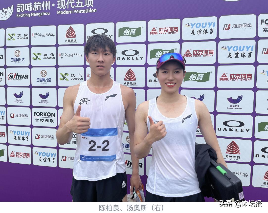 6月21日,“韻味杭州”浙江大華杯2023年全國現代五項錦標賽在富陽銀湖體育中心落幕。當天,來自湖北的湯奧斯和陳柏良以1363分的成績獲得現代五項混合接力的冠軍。