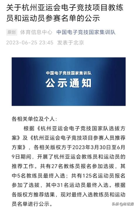6月25日深夜,中國電子競技國家集訓隊公示了杭州亞運會最終的電子競技項目教練員和運動員的參賽名單。王者榮耀亞運版本、和平精英亞運版本、英雄聯盟、DOTA2、夢三國2、FIFA online4六大項目的“電競國家隊”千呼萬喚始出來,5名教練、31名運動員正式亮相,其中3人來自浙江。