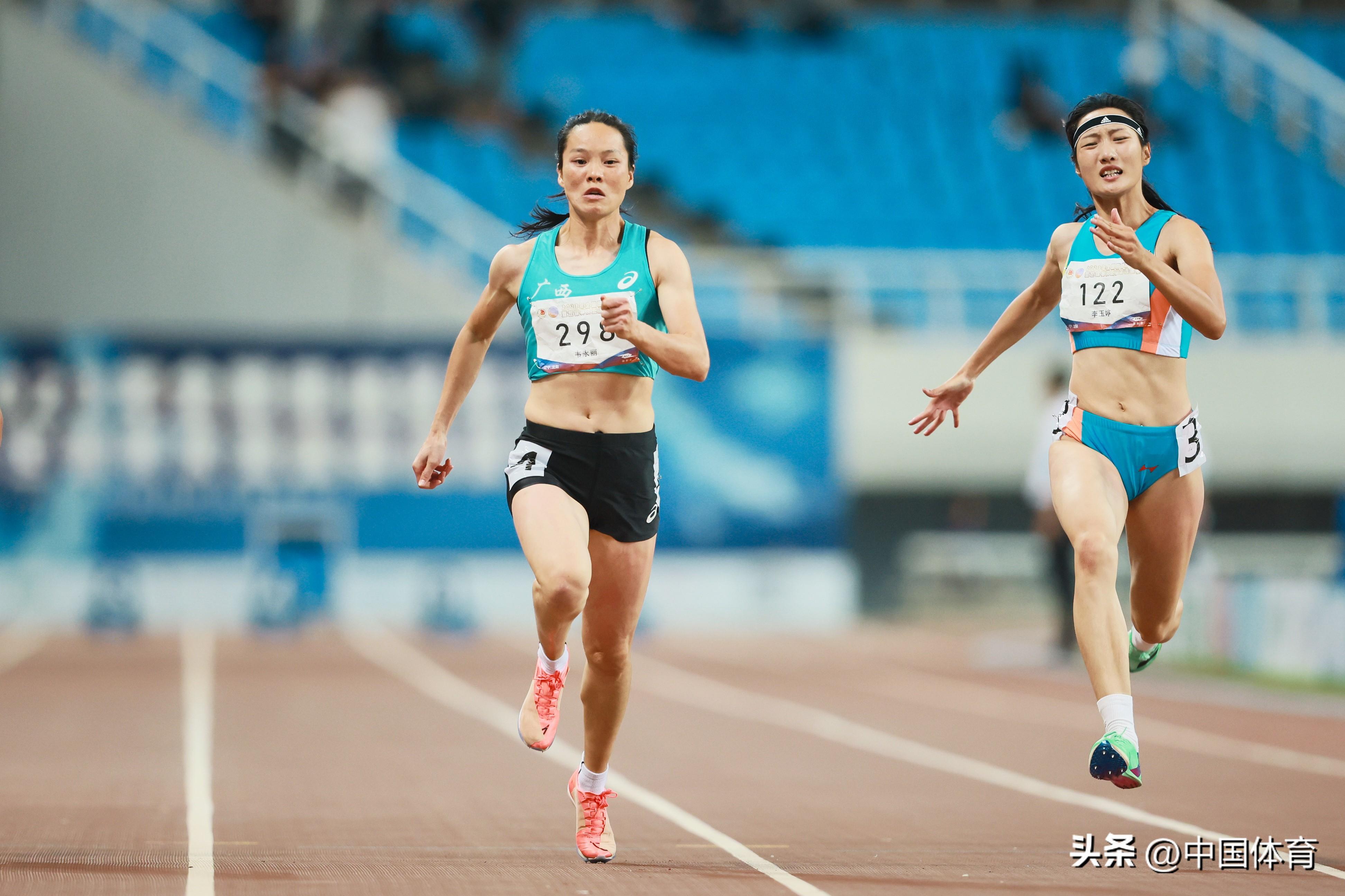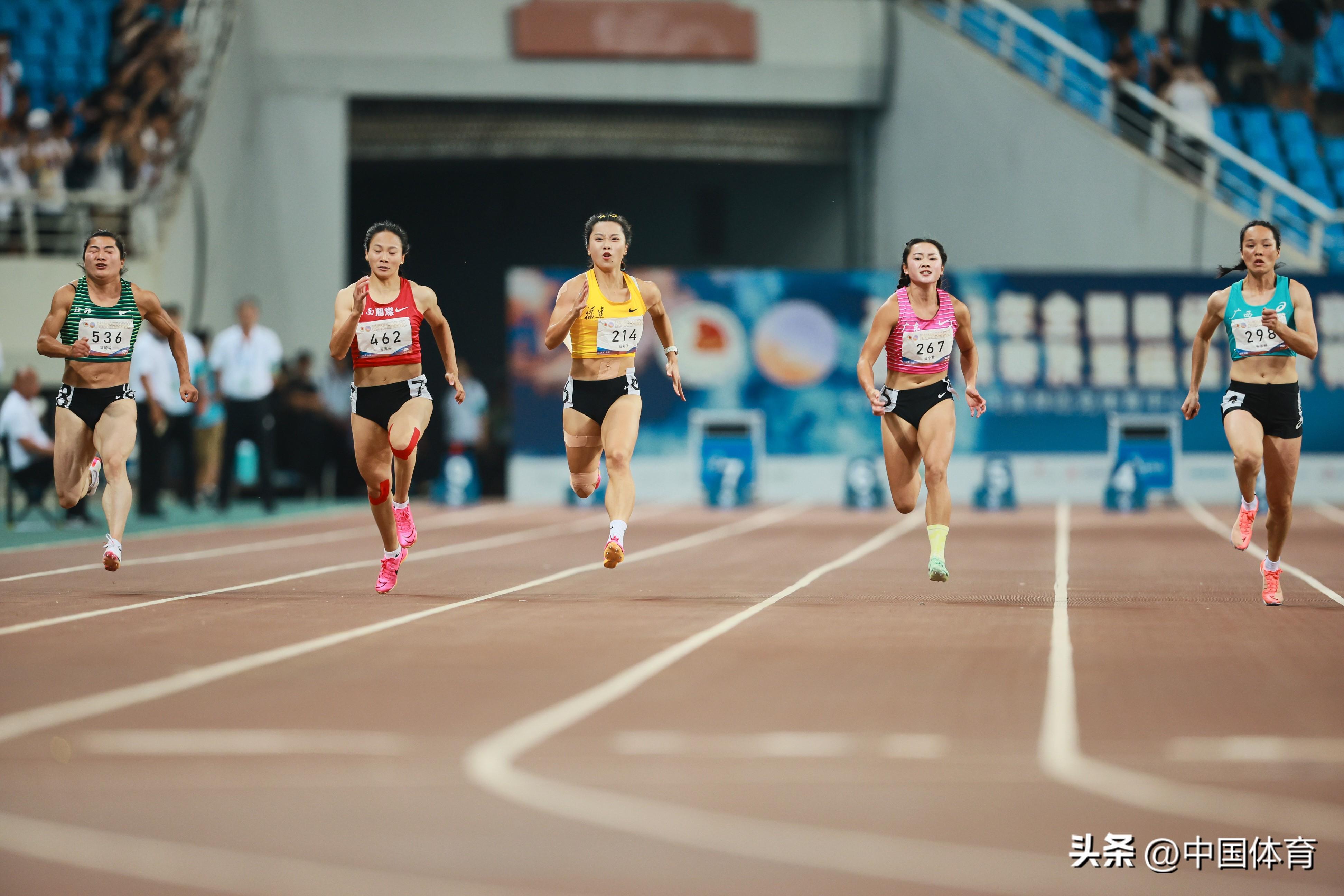 女子100米決賽中,廣西隊韋永麗以11秒42問鼎,福建隊葛曼棋以11秒44獲得銀牌,江蘇鐵人隊袁琦琦以11秒45位在第三。