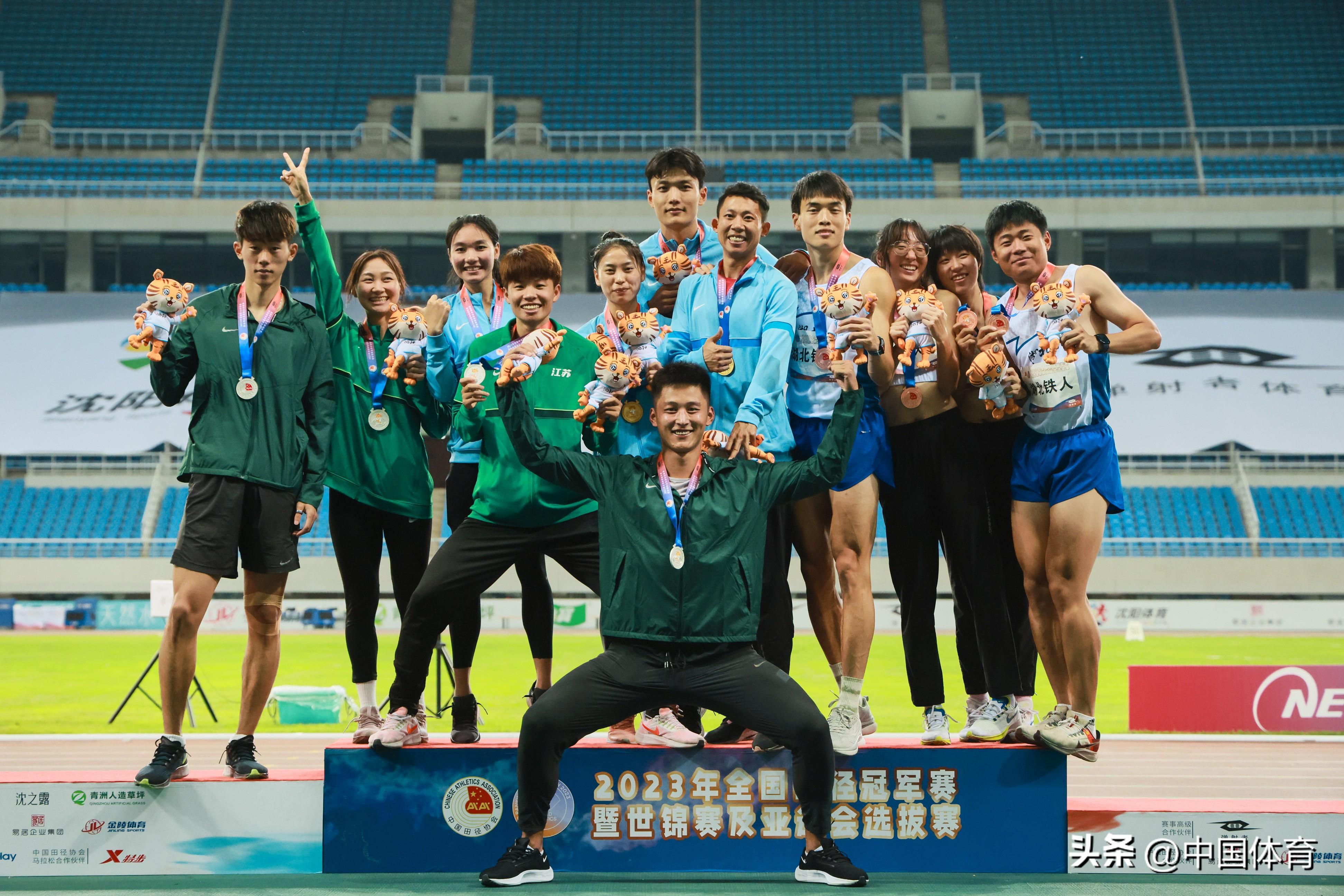 冠軍四川鐵人隊(中)亞軍江蘇鐵人 隊(左)季軍湖北鐵人(右)隊在男女混合4x400米接力頒獎儀式上