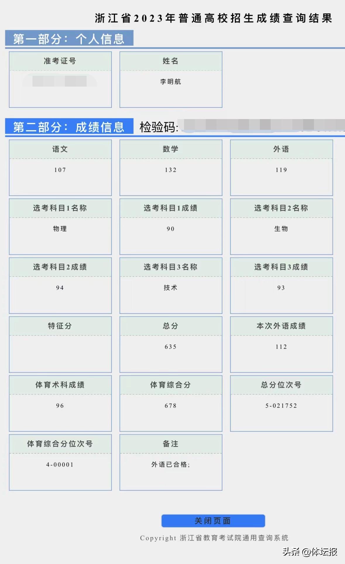 語文107分、數學132分、英語119分、選考的物理90分、生物94分、技術93分,總分635分——這是李明航的文化課成績。再加上體育術科96分,根據“96X3.75+635×50%”的算法(綜合成績四捨五入保留整數),他的體育綜合分爲678分,體育綜合分位次號4-00001,成爲今年浙江高考“體育狀元”。