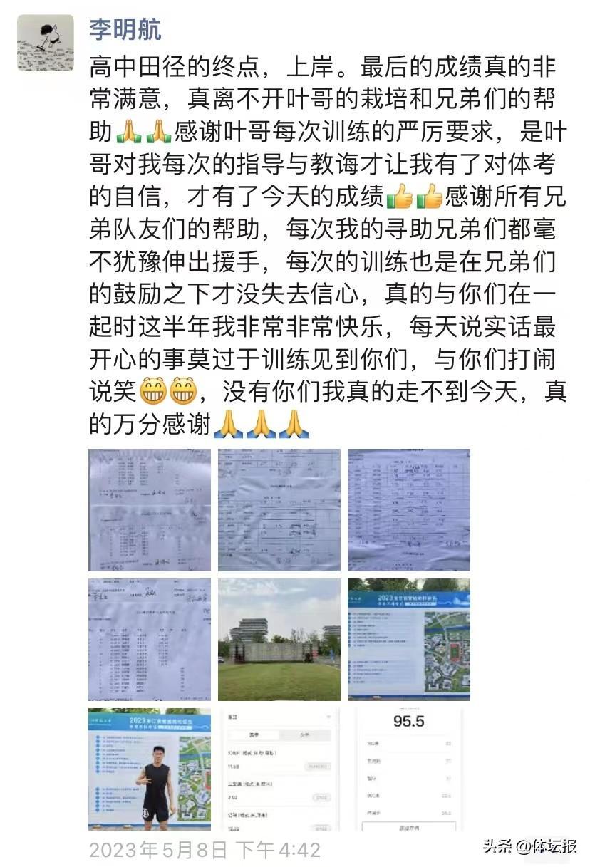 體育術科考試結束後,李明航發了一條朋友圈:“高中田徑的終點,上岸。最後的成績真的非常滿意,真離不開葉哥的栽培和兄弟們的幫助。每次我的尋助,兄弟們都毫不猶豫伸出援手,每次的訓練也是在兄弟們的鼓勵之下才沒失去信心,沒有你們我真的走不到今天,真的萬分感謝。”