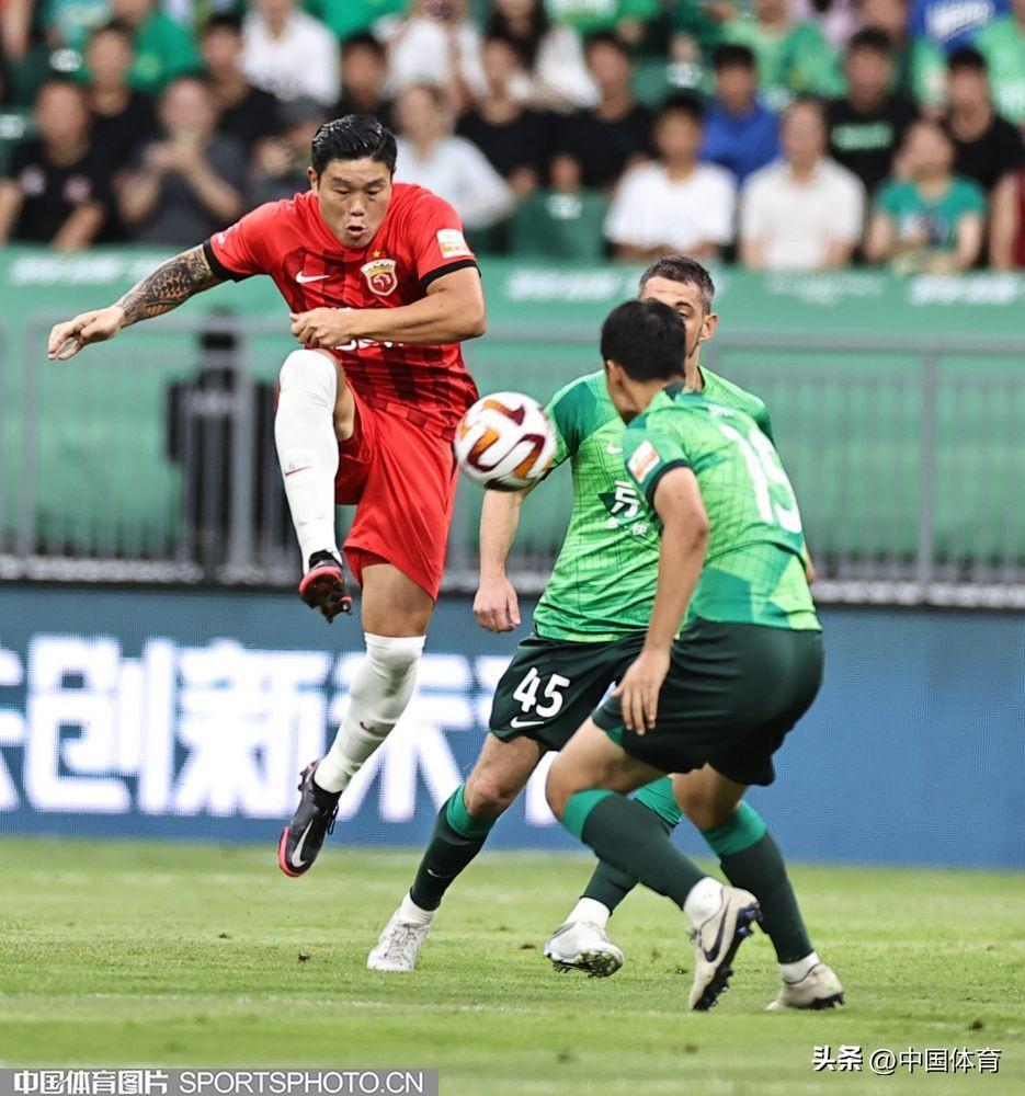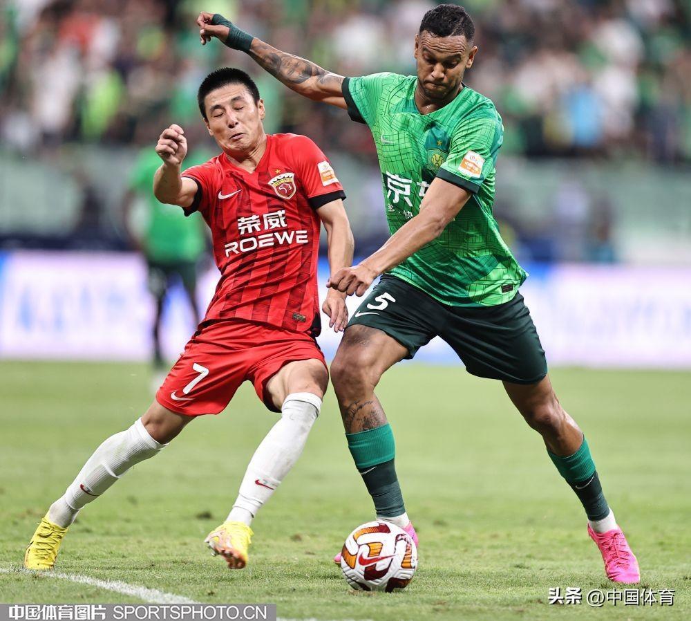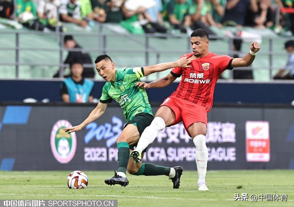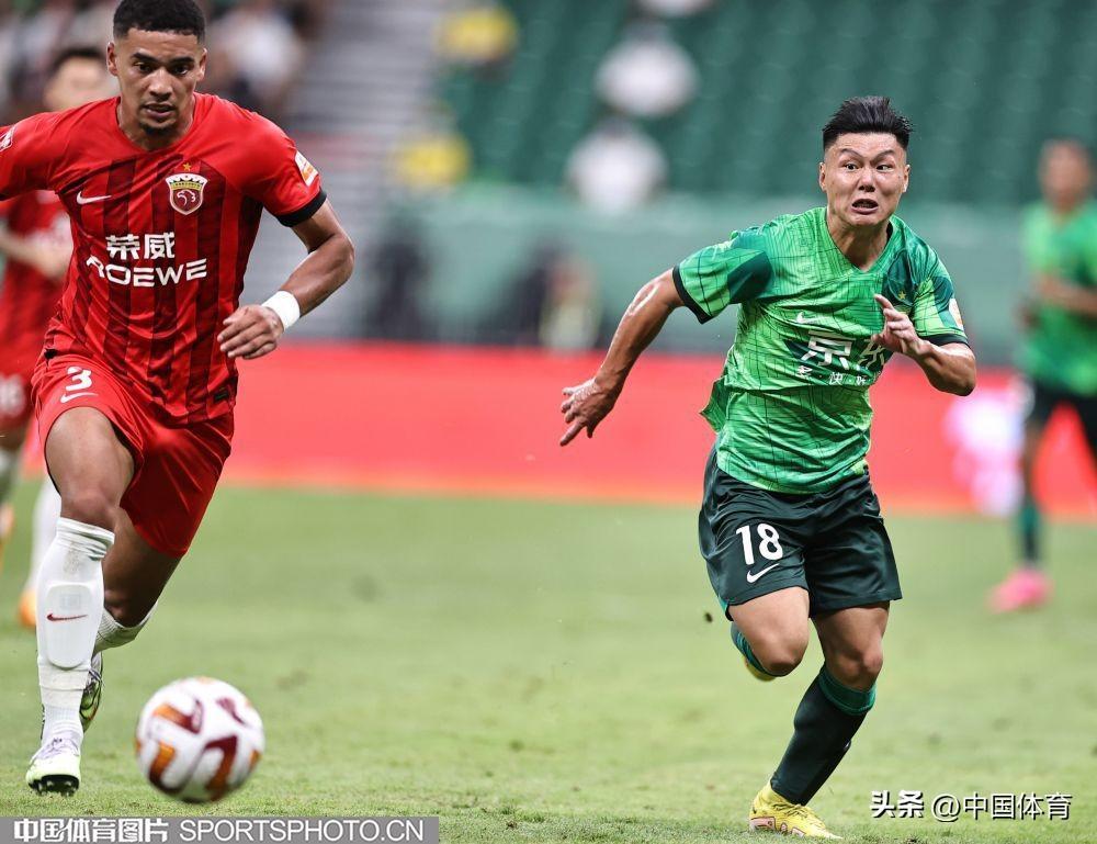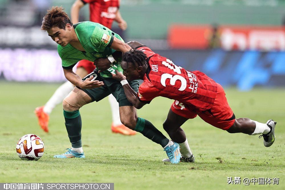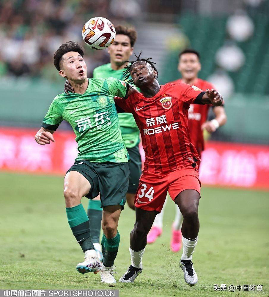 中國體育訊 6月29日,2023賽季中國足協超級聯賽繼續第十三輪爭奪。在北京工人體育場,主場作戰的北京國安隊(綠衣)以1比2負於上海上港隊(紅衣)。上半場,北京國安先入一球,但裁判組判罰越位在先。隨後,呂文君破門得分,助力上海上港隊1比0結束上半場戰鬥。易邊再戰,上海上港隊由買提江擴大戰果。第80分鐘,方昊把握住機會,爲北京國安扳回一球。(中國體育圖片 王憲民 攝)